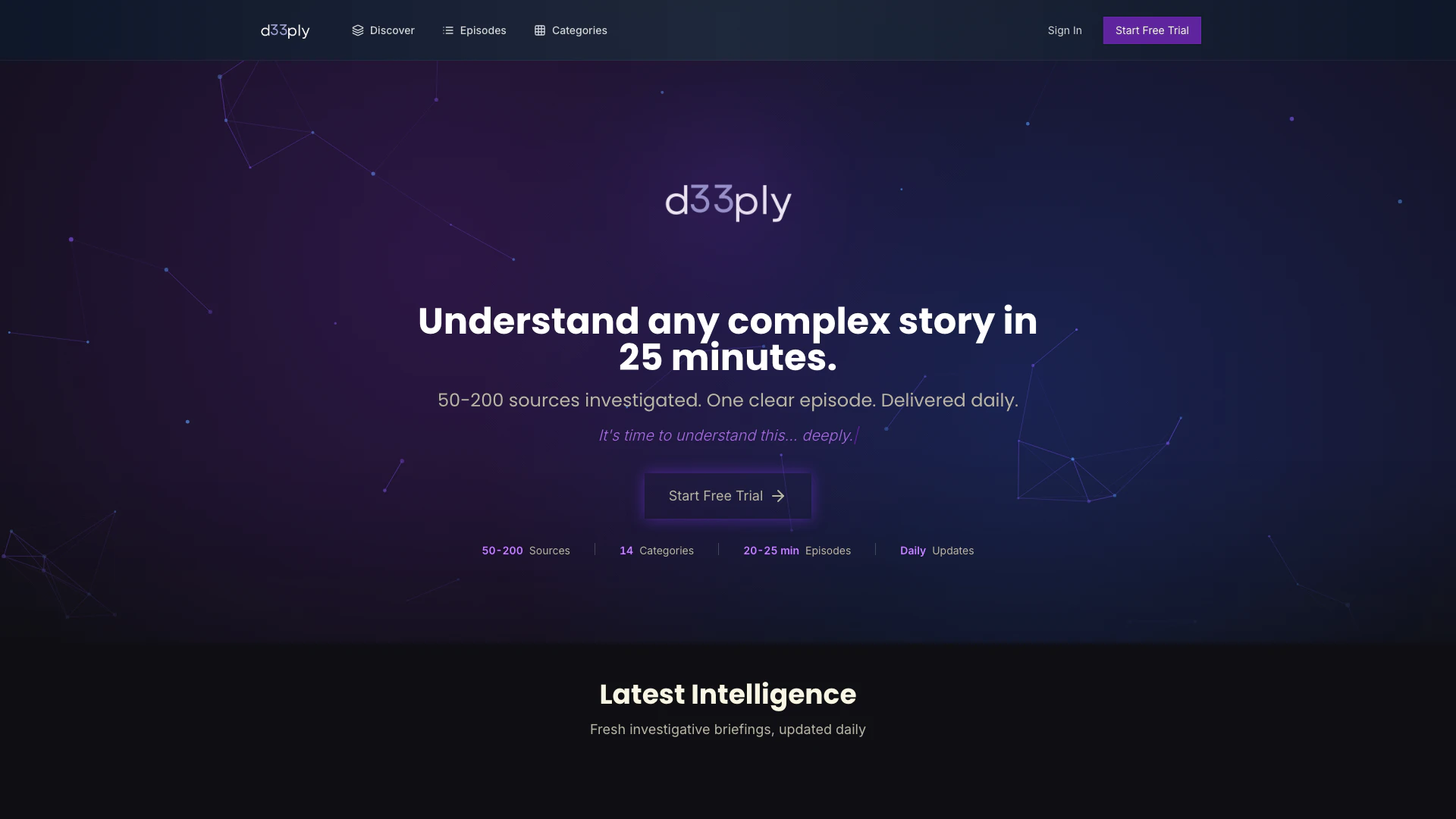 - Comprehensive Investigative Analysis[1]: D33ply analyzes 50-200 sources per episode, ensuring thorough coverage of topics.