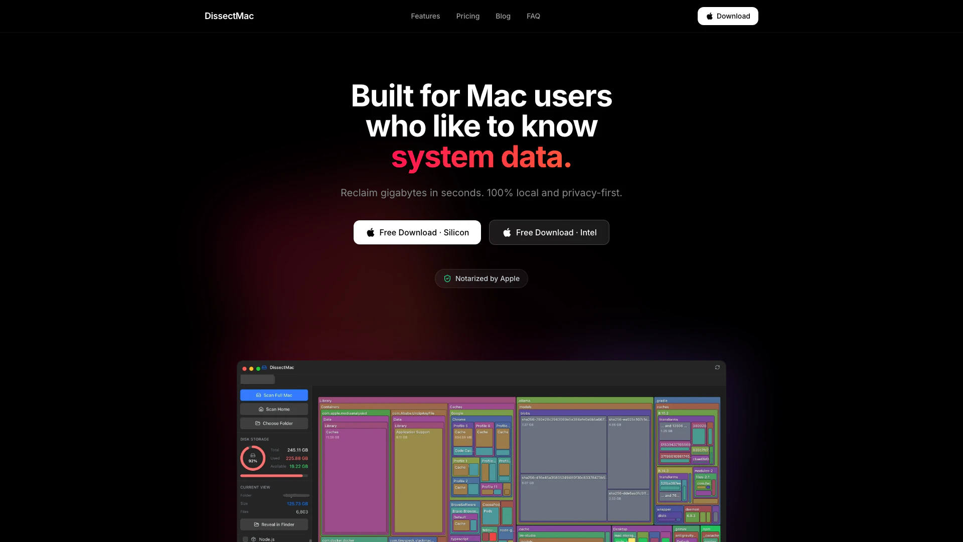 DissectMac is a free Mac storage analyzer[1] designed to help users visualize and manage disk usage[2] on their Mac devices. It offers an interactive treemap[3] that clearly illustrates what is taking up space on the hard drive, allowing users to identify large files and folders quickly. Built for macOS Sonoma, Sequoia, and Apple Silicon, DissectMac emphasizes local processing to maintain user privacy, ensuring that files never leave the user's device. With its powerful features, DissectMac enables users to reclaim storage space efficiently and effectively.