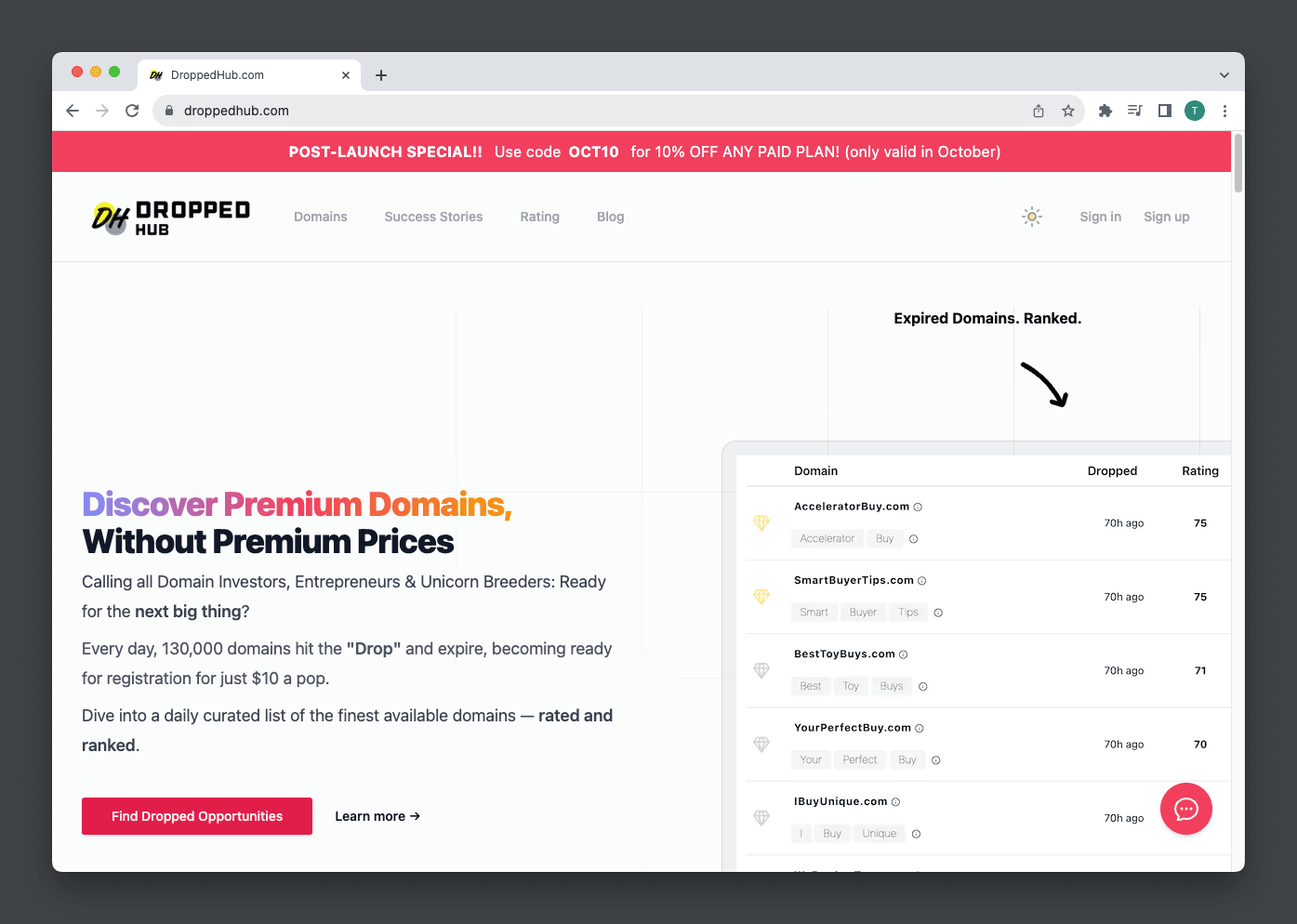 Dropped Hub is an AI-powered platform that analyzes and rates over 100,000 expired domains daily. It filters, evaluates, and categorizes domains by their brandability and resellability scores (0-100) to help users identify high-value domains for registration or investment.