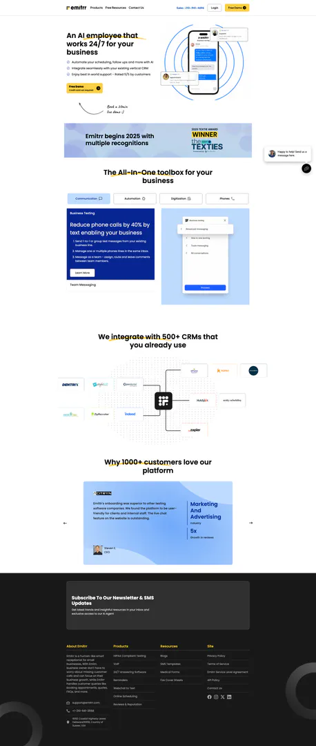 Emitrr is a comprehensive business toolbox designed to enhance communication and customer engagement for local businesses. By leveraging text messaging and automation, Emitrr enables businesses to streamline their interactions with customers, reduce no-shows, and improve overall efficiency. This platform integrates various functionalities, including business texting, appointment reminders, online scheduling, and VoIP phone services, allowing businesses to manage all their communication needs from a single interface.