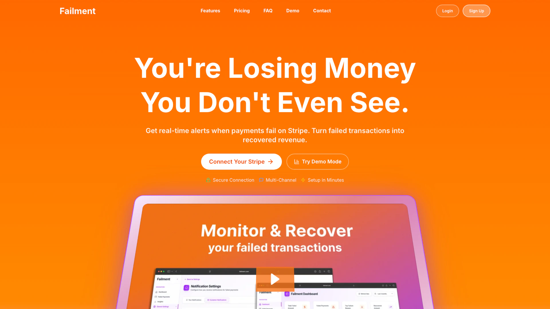 Failment is an innovative tool designed to help businesses recover lost revenue from failed payments[1], particularly for those using the Stripe payment platform. It provides real-time alerts[2] and analytics to monitor payment failures, enabling businesses to act quickly and recover funds that would otherwise go unnoticed. By addressing the common issue of failed subscription payments, which can average 8% monthly, Failment empowers companies to turn potential revenue loss into recovered income through proactive monitoring and automated recovery campaigns.