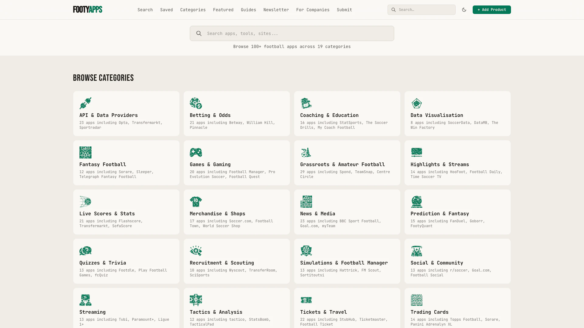 - Comprehensive Directory of Football Apps: Footyapps offers a wide-ranging directory featuring over 100 football apps across 19 categories, making it easy for users to find the tools they need.