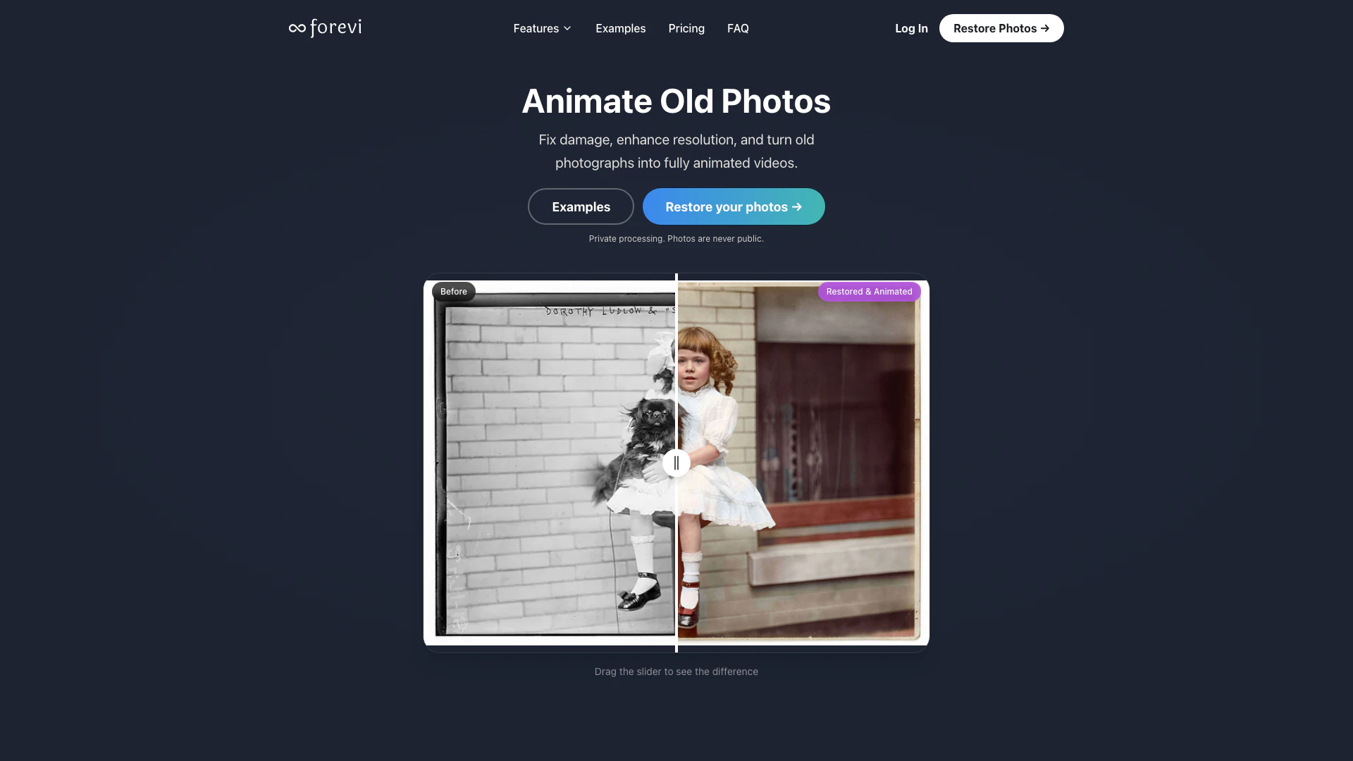 Foreviai is an advanced AI-powered[1] tool designed to restore, colorize, and enhance old photographs, bringing them back to life with remarkable detail and realism. By utilizing cutting-edge technology, Foreviai not only repairs damaged images but also adds vibrant colors and enhances resolution to achieve stunning results. Users can also animate their photos with motion and sound, recreating the moments captured in the images. This makes Foreviai a versatile solution for anyone looking to preserve and revitalize their cherished memories.