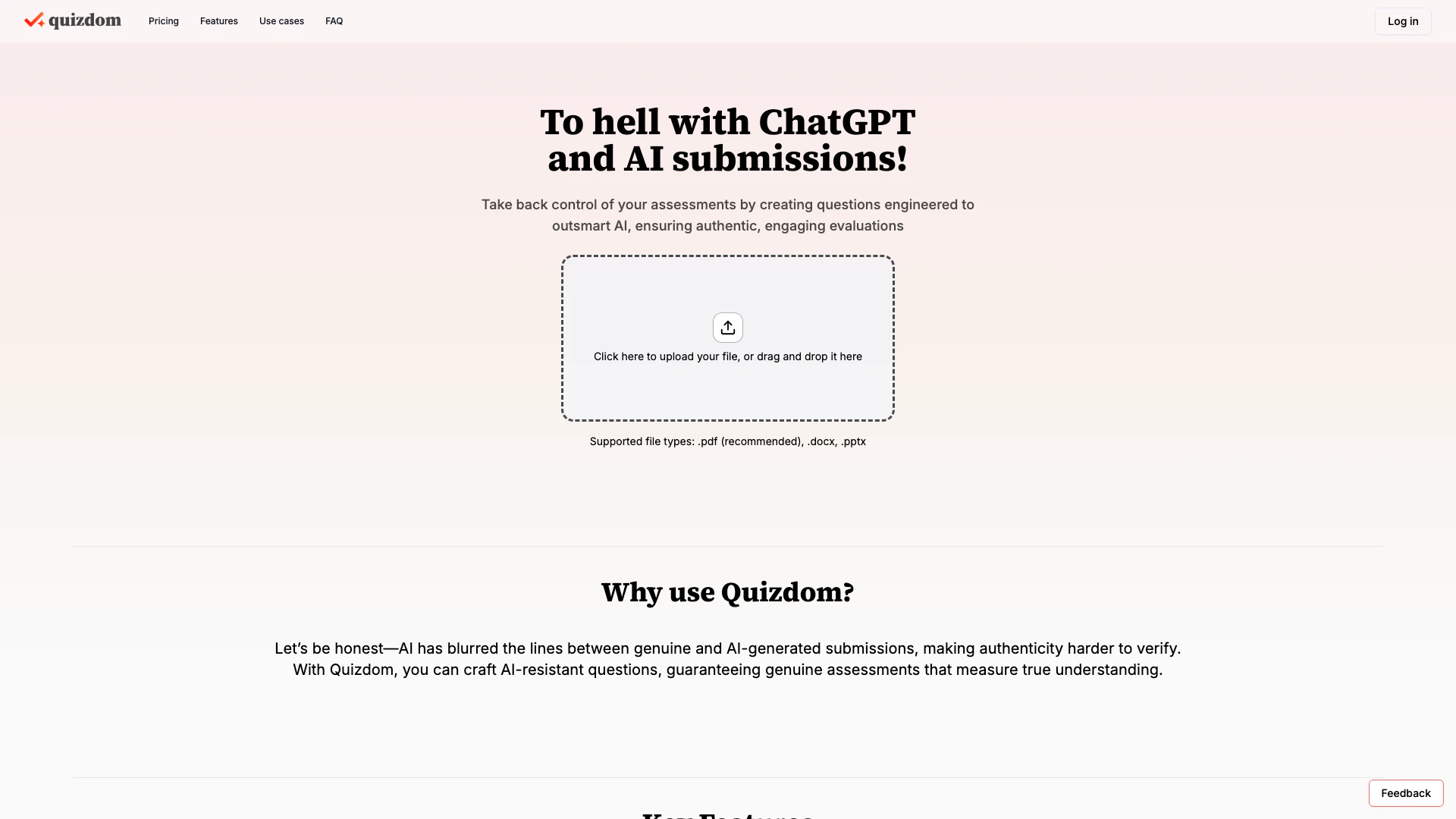 Getquizdom is an innovative tool designed to facilitate the creation, customization, and grading of high-quality assessments, quizzes, and tests with AI-powered precision. It aims to help educators, corporate trainers, interviewers, and assessors craft assessments that are resistant to AI-generated submissions, ensuring authenticity and accuracy in evaluations. The platform leverages intelligent content understanding and instant question generation to streamline the assessment process, making it easier for users to create meaningful evaluations that accurately measure understanding.