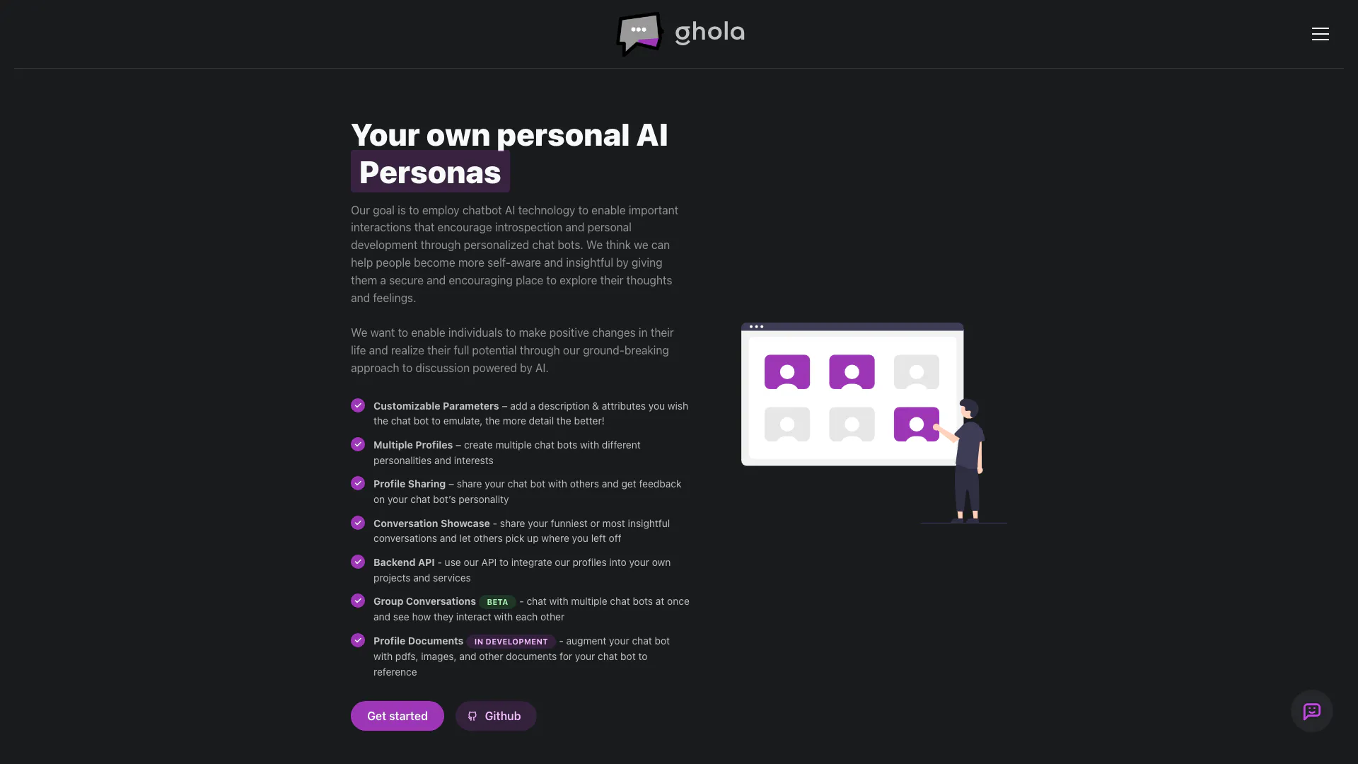 Gholaai is a cutting-edge AI chatbot platform designed to foster personal development and self-awareness through customized AI personas. By enabling users to create personalized chatbots, Gholaai offers a unique space for introspection and meaningful conversations. Its core mission is to help individuals explore their thoughts and feelings in a secure environment, ultimately facilitating positive life changes and unlocking one's full potential. With features like customizable parameters, multiple profiles, and conversation sharing, Gholaai stands out as a powerful tool for personal growth.