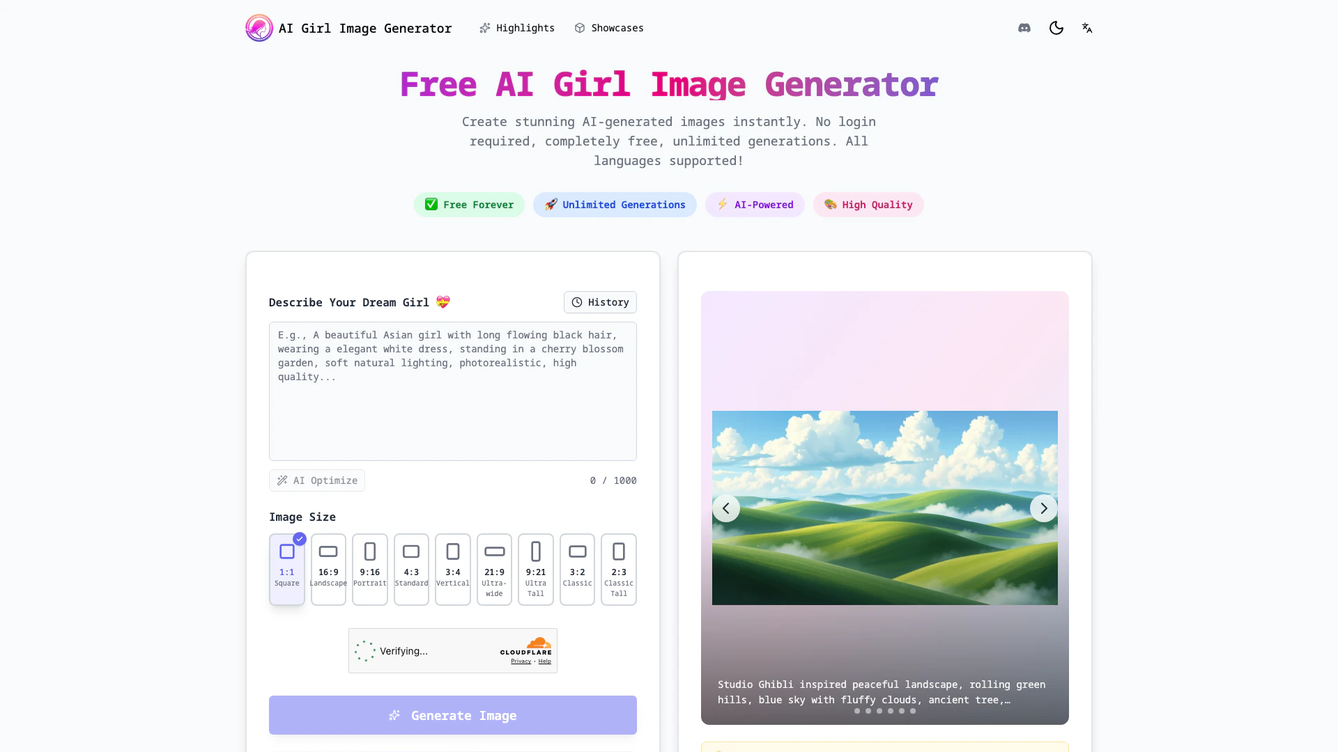 Create stunning AI-generated images instantly. No login required, completely free, unlimited generations. All languages supported! 100% Free AI Image Generator. Requires no registration and has no hidden fees. Generate unlimited AI girl images for free with no limits. Fast AI image generation - most images created within 30 seconds. Your AI-generated images are not saved on our servers.