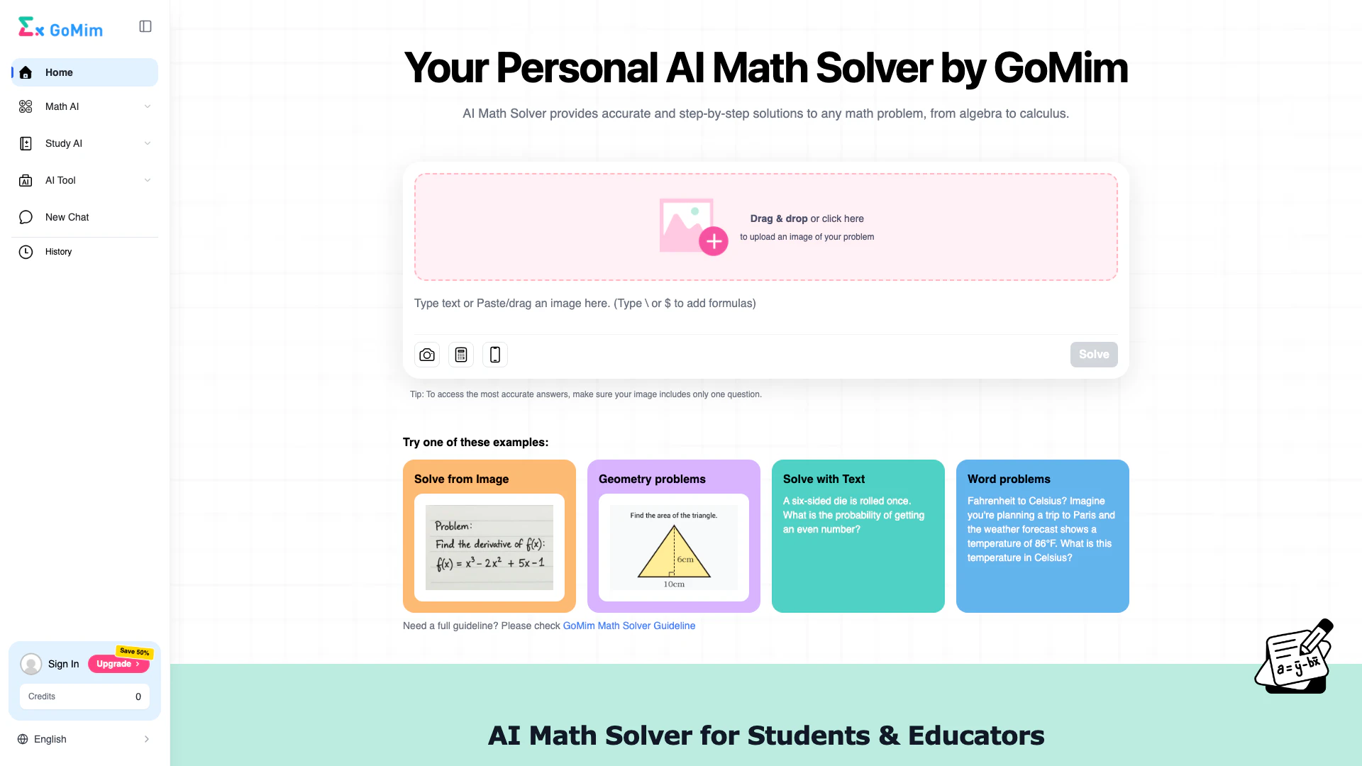 Simply input or upload a math problem, and GoMim AI math solver will break it down with step-by-step answers. Powered by advanced AI, it tackles everything from basic algebra to complex calculus problems.