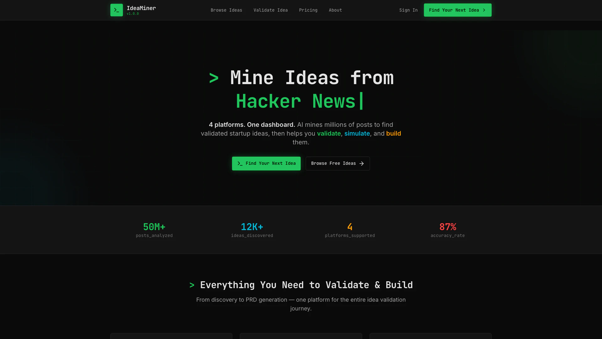 - Multi-Platform Discovery: Mine startup ideas from multiple platforms including Reddit, Hacker News, Product Hunt, and G2 Reviews.