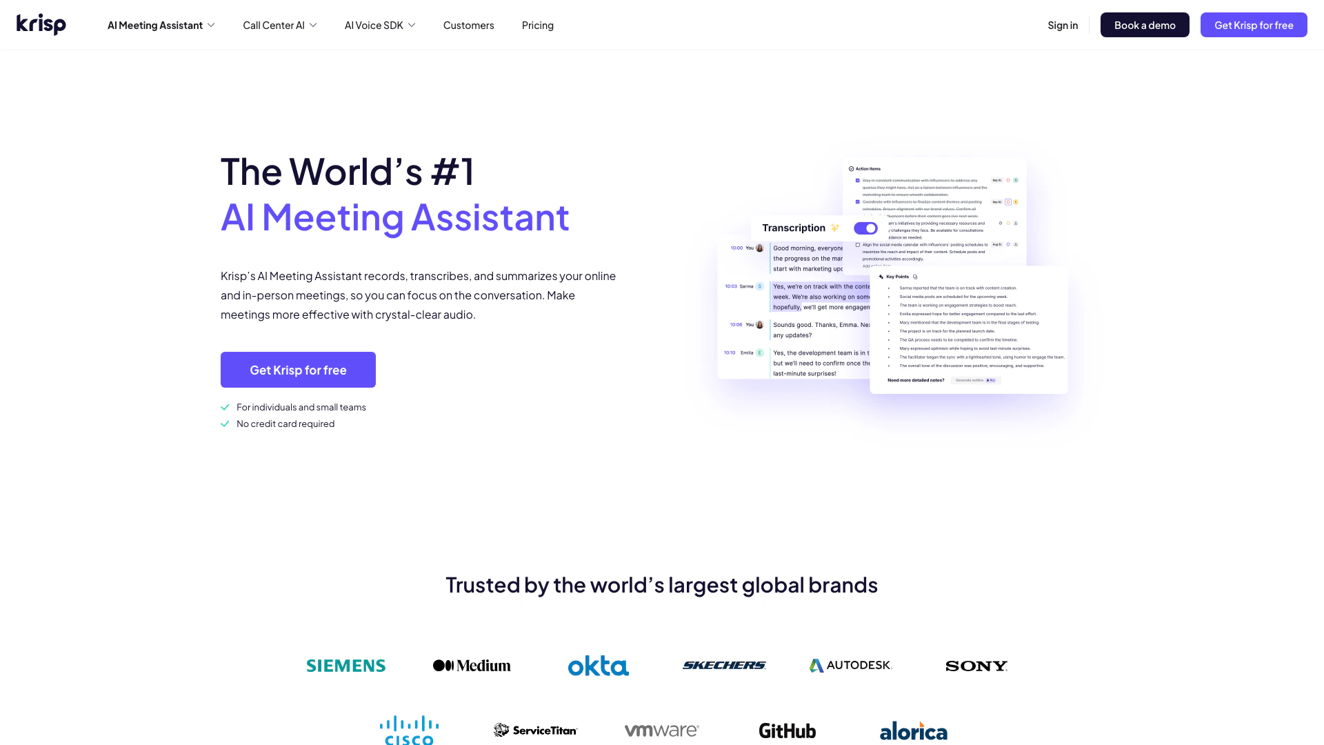 Krispai is an innovative AI Meeting Assistant[1] designed to enhance collaboration and efficiency during meetings. It transcribes notes, records tasks, and provides summaries, allowing users to focus on the conversation rather than manual note-taking. By leveraging advanced AI technology, Krispai offers features like real-time transcription[2], noise cancellation[4], and accent conversion[5], making it an essential tool for individuals and teams seeking to improve their meeting productivity.