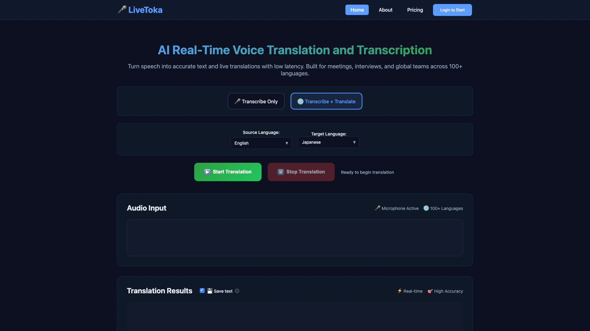 - Go to the LiveToka website and click on 'Start Translation'.
