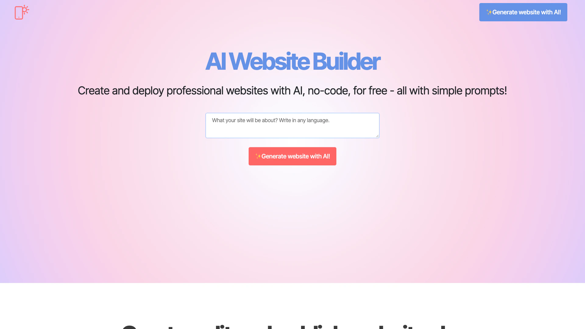 Mobirise is an innovative AI website builder[1] that enables users to design and launch professional websites in seconds using simple prompts. It leverages advanced artificial intelligence to create visually stunning, fully functional websites without the need for coding or design expertise. Users can describe their desired outcome in any language, and the AI translates these prompts into unique website designs, complete with engaging content and optimized layouts. Additionally, Mobirise offers a code export feature, allowing users to maintain complete ownership and flexibility by downloading the full HTML, CSS[2], and JavaScript[3] source code of their websites.