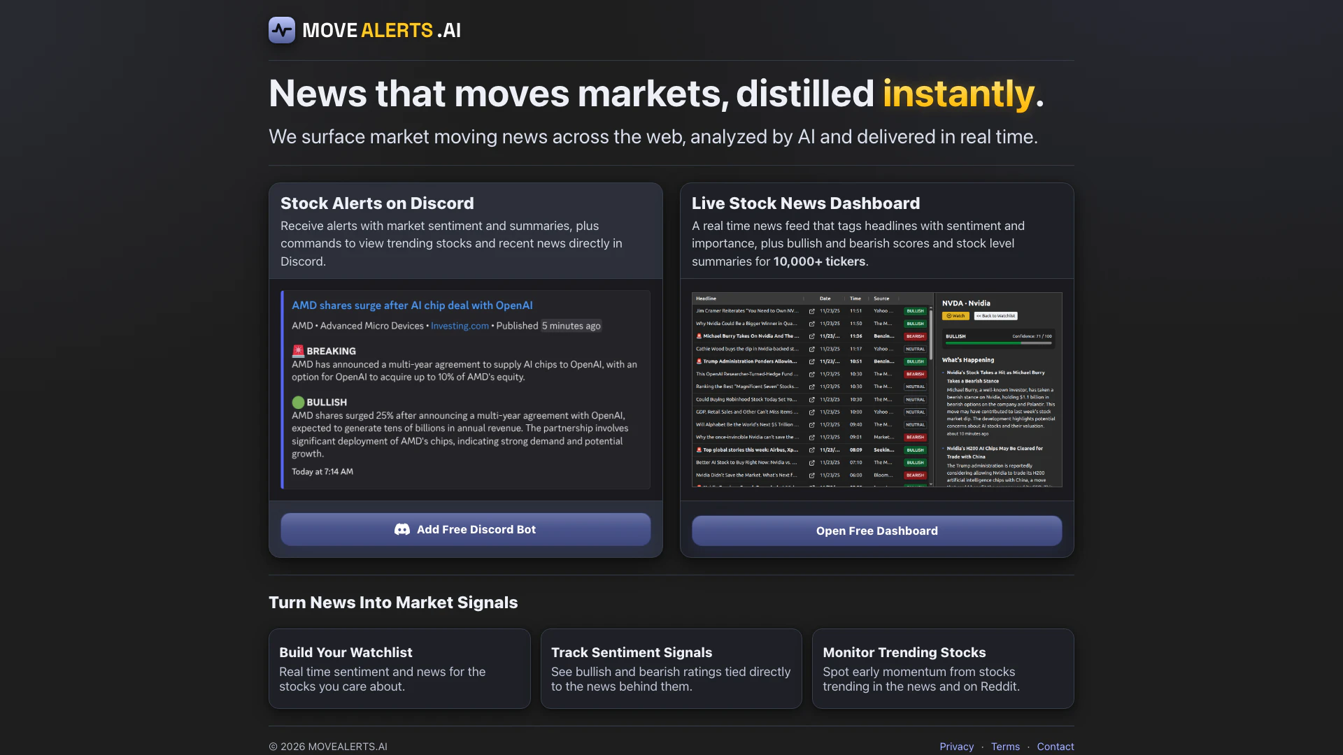 - Join the Movealertsai Discord channel to receive real-time alerts[1] and market sentiment[3] summaries.