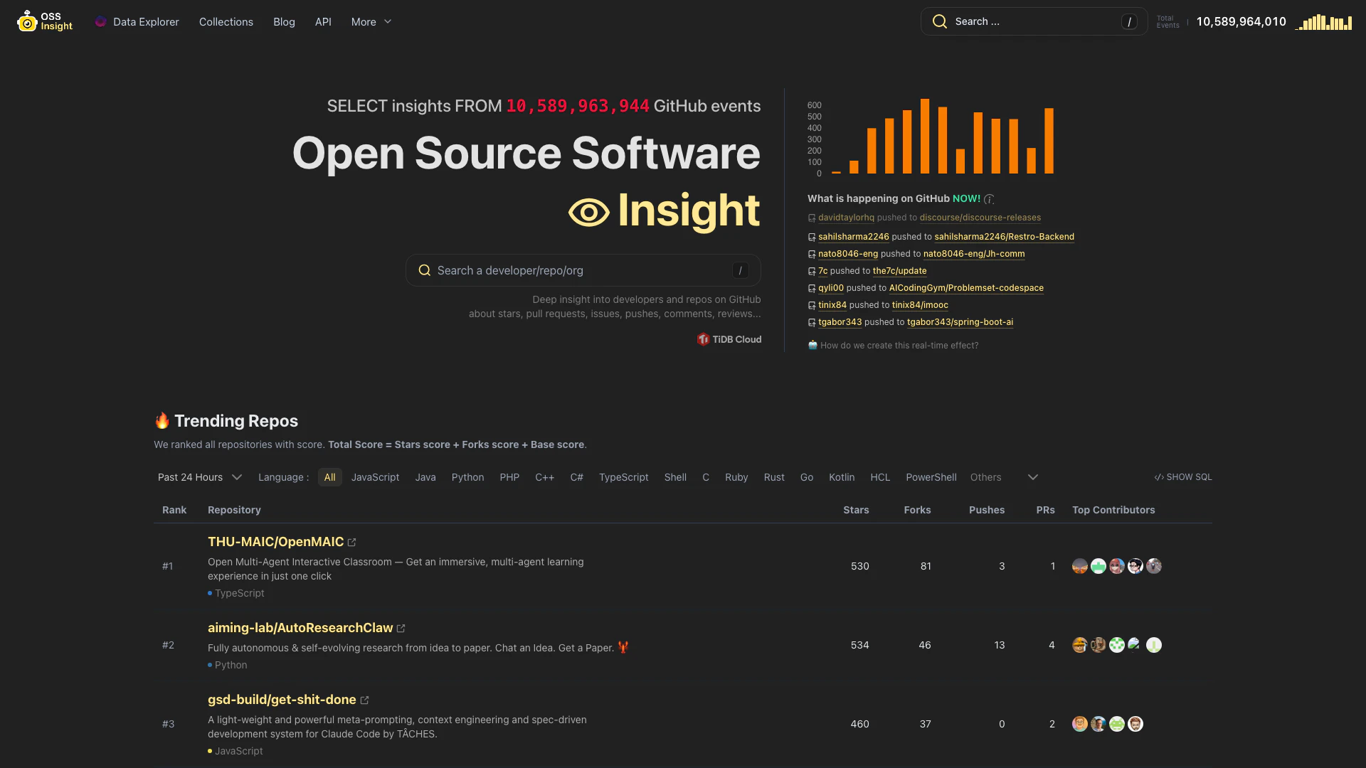 - Real-time GitHub Event Tracking: OSSInsight tracks over 10 billion GitHub events in real time, providing up-to-date insights into open source projects.