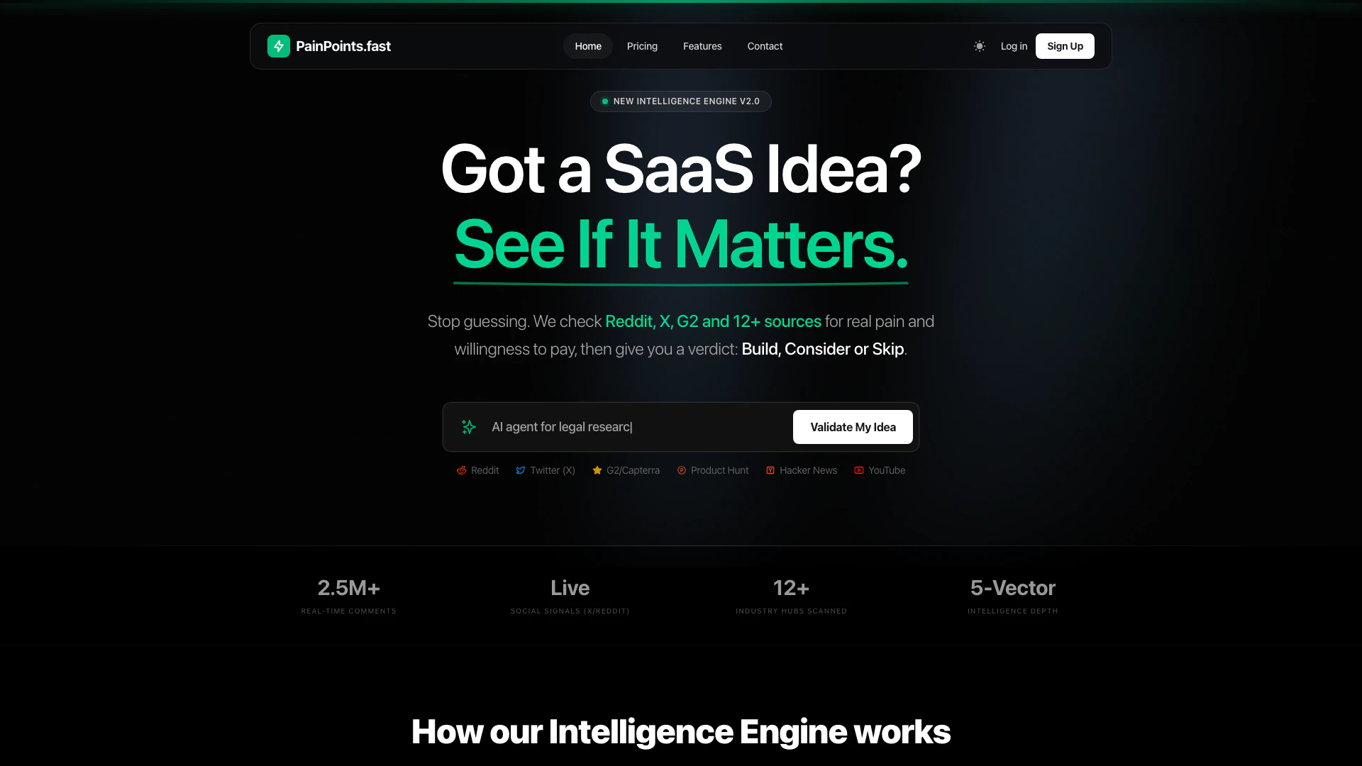 PainPoints.fast validates a SaaS idea by scanning over 12 sources, including Reddit, X, and G2, to find real user pain points and willingness to pay. It analyzes millions of data points to provide a verdict on whether to build, consider, or skip the idea.