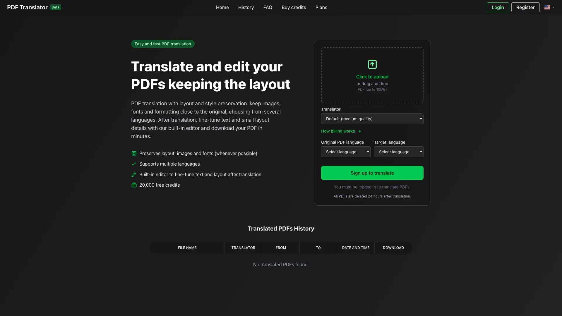 - Free Credits: Offers 20,000 free credits to start translating PDFs, making it accessible for new users.