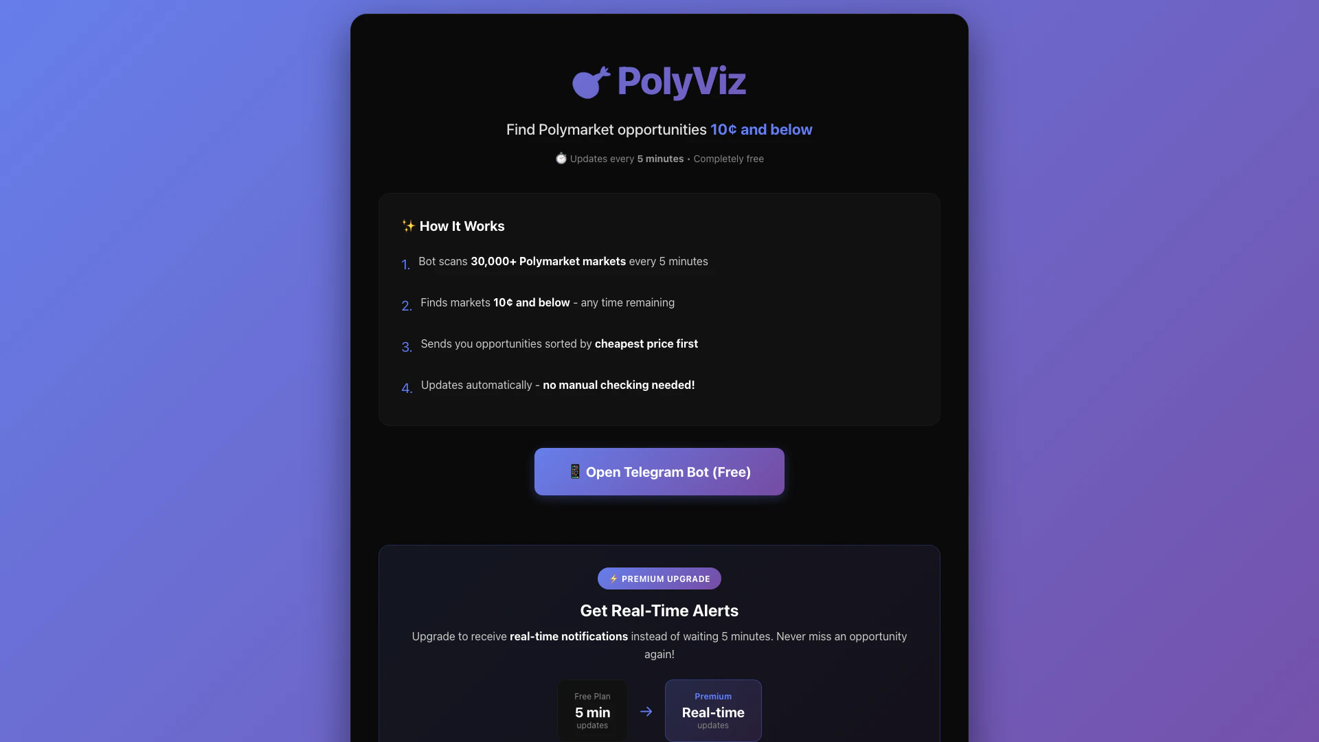 - Free Notifications: Polyviz offers completely free notifications for Polymarket opportunities priced at 10¢ and below, making it accessible for all users.