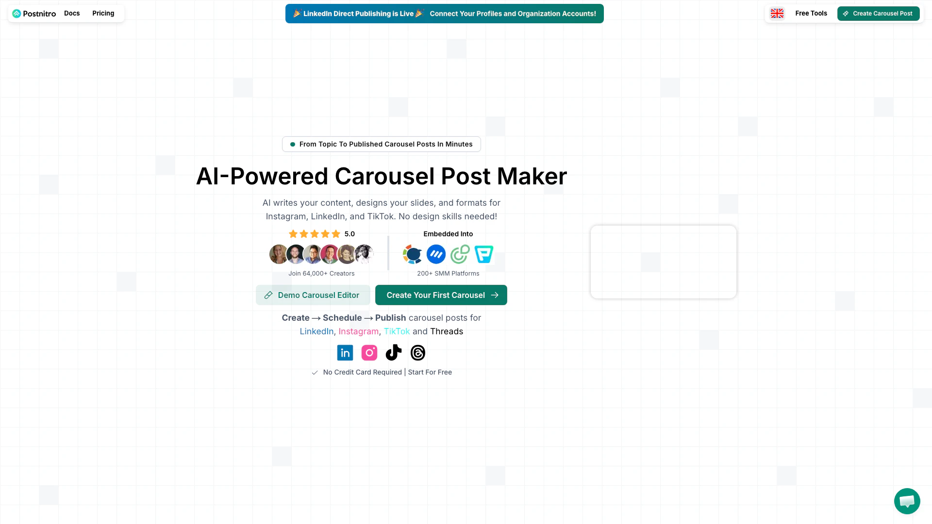 PostNitro is an AI-powered[1] carousel maker[2] designed to create visually captivating carousels for social media platforms such as Instagram, LinkedIn, and TikTok. This innovative tool leverages artificial intelligence to automate content writing, slide design, and formatting, enabling users to produce engaging carousel posts without requiring any design skills. With PostNitro, users can transform ideas into professional-quality carousels in minutes, ultimately driving social engagement and growth.