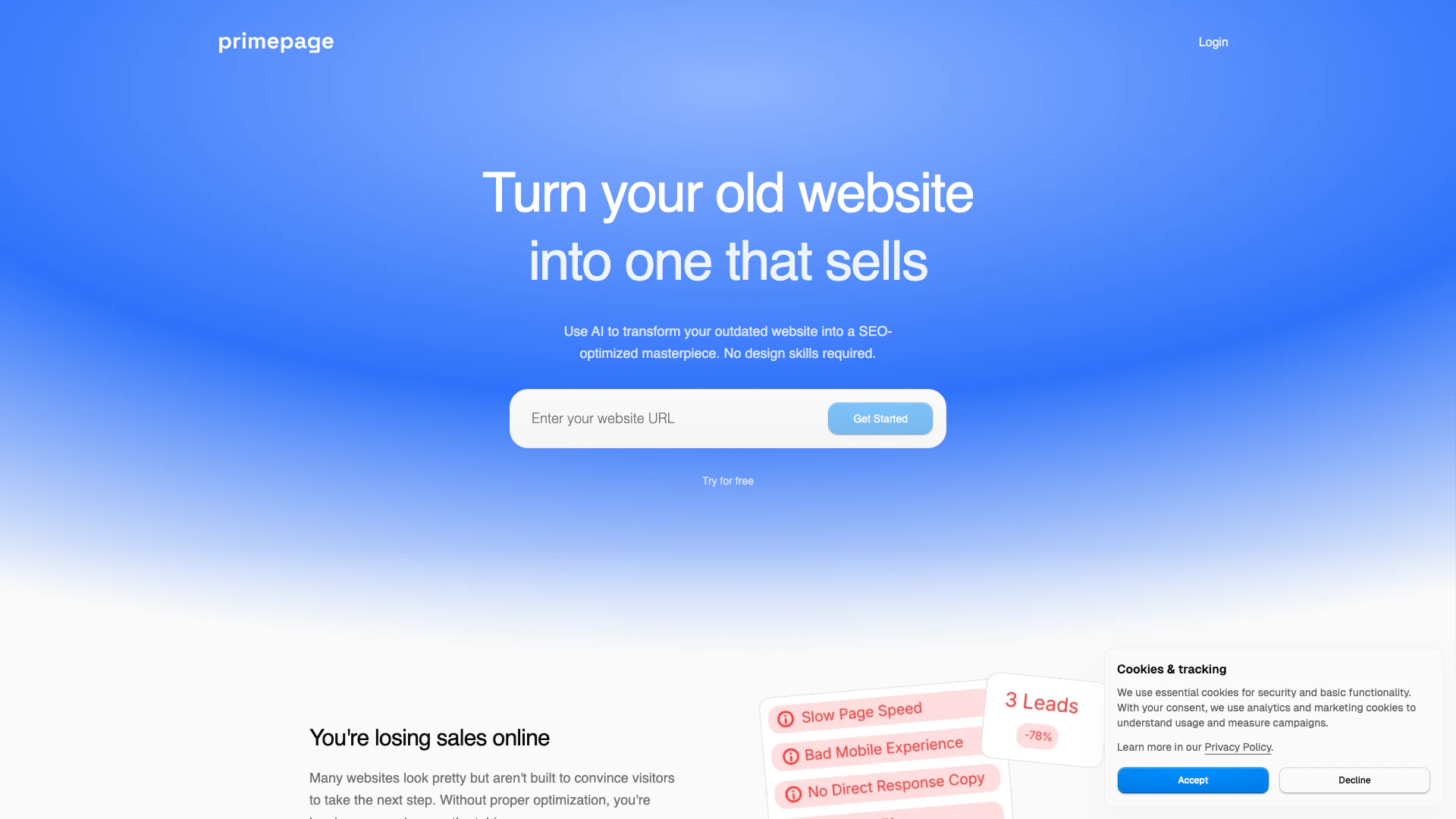 Primepage uses advanced AI to analyze your existing website or business information and automatically generates a modern, SEO-optimized website. Simply enter your website URL or business details, and our AI creates a professional design tailored to your brand in minutes. No coding or design skills required.