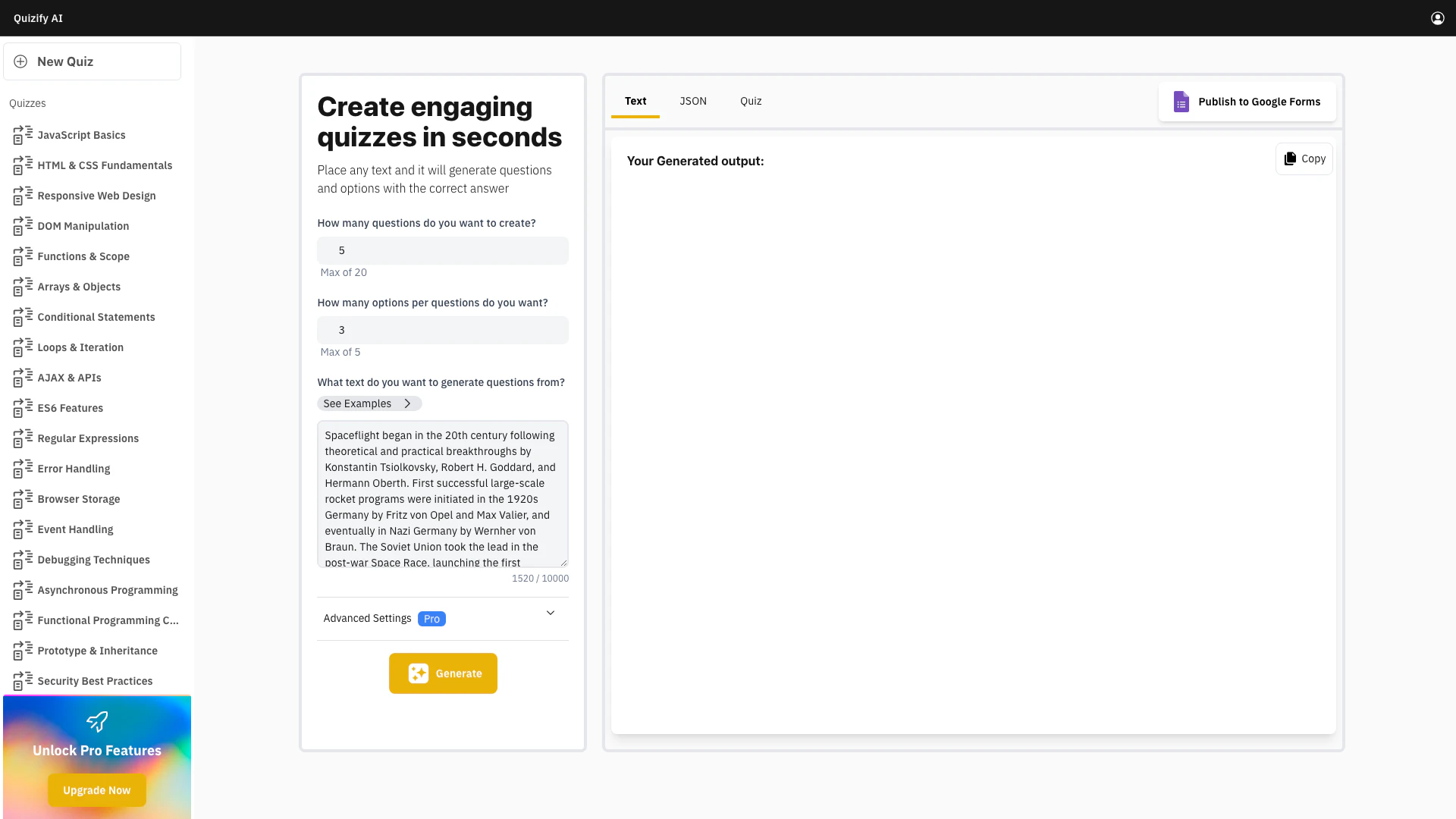- You can then publish the quiz to Google Forms or copy the generated output for further use.