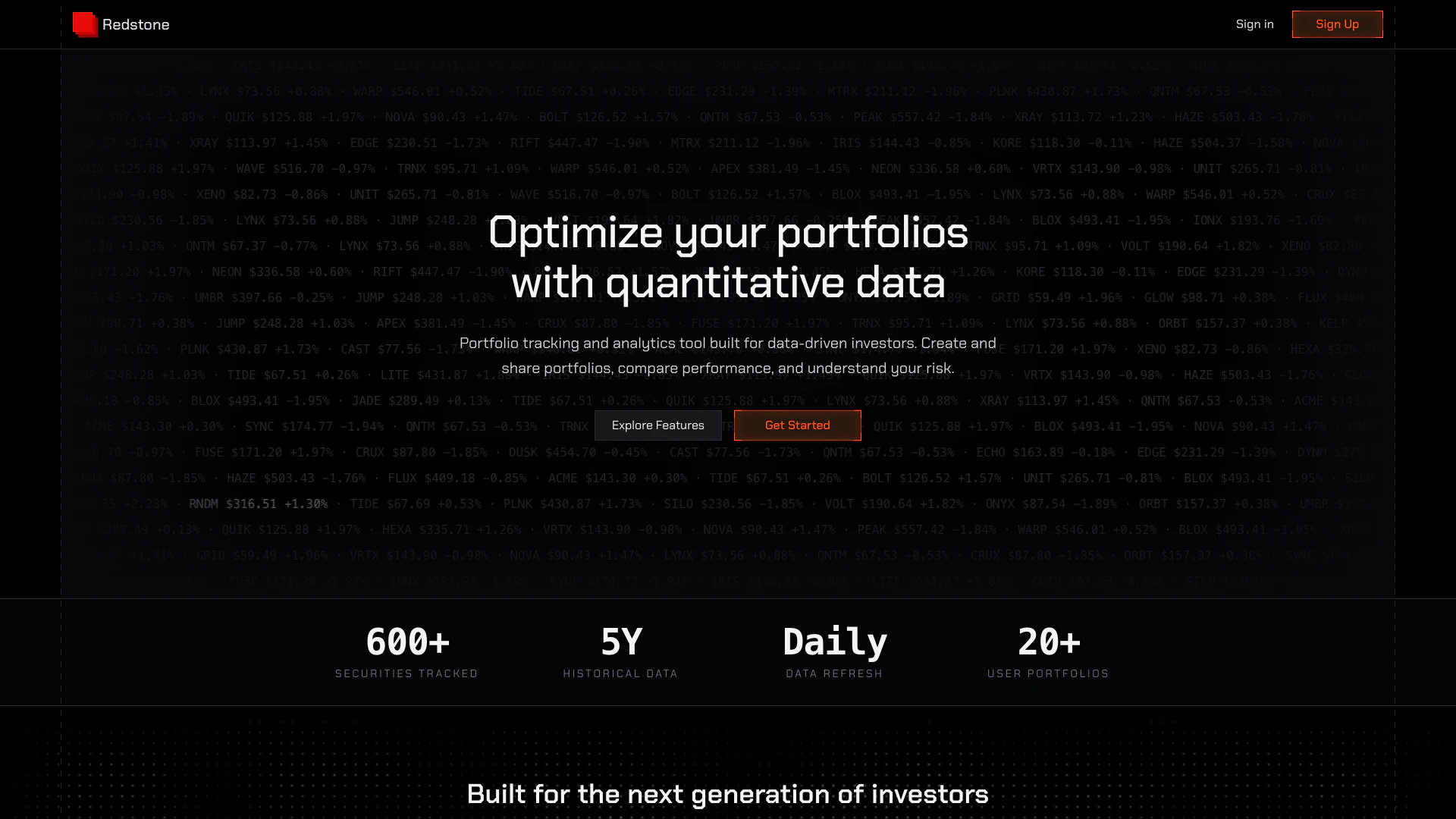 Redstone is a portfolio analytics platform for quantitative investors. It helps you track portfolio performance, analyze risk metrics like Sharpe ratio and Sortino ratio, and make data-driven investment decisions using institutional-grade tools.