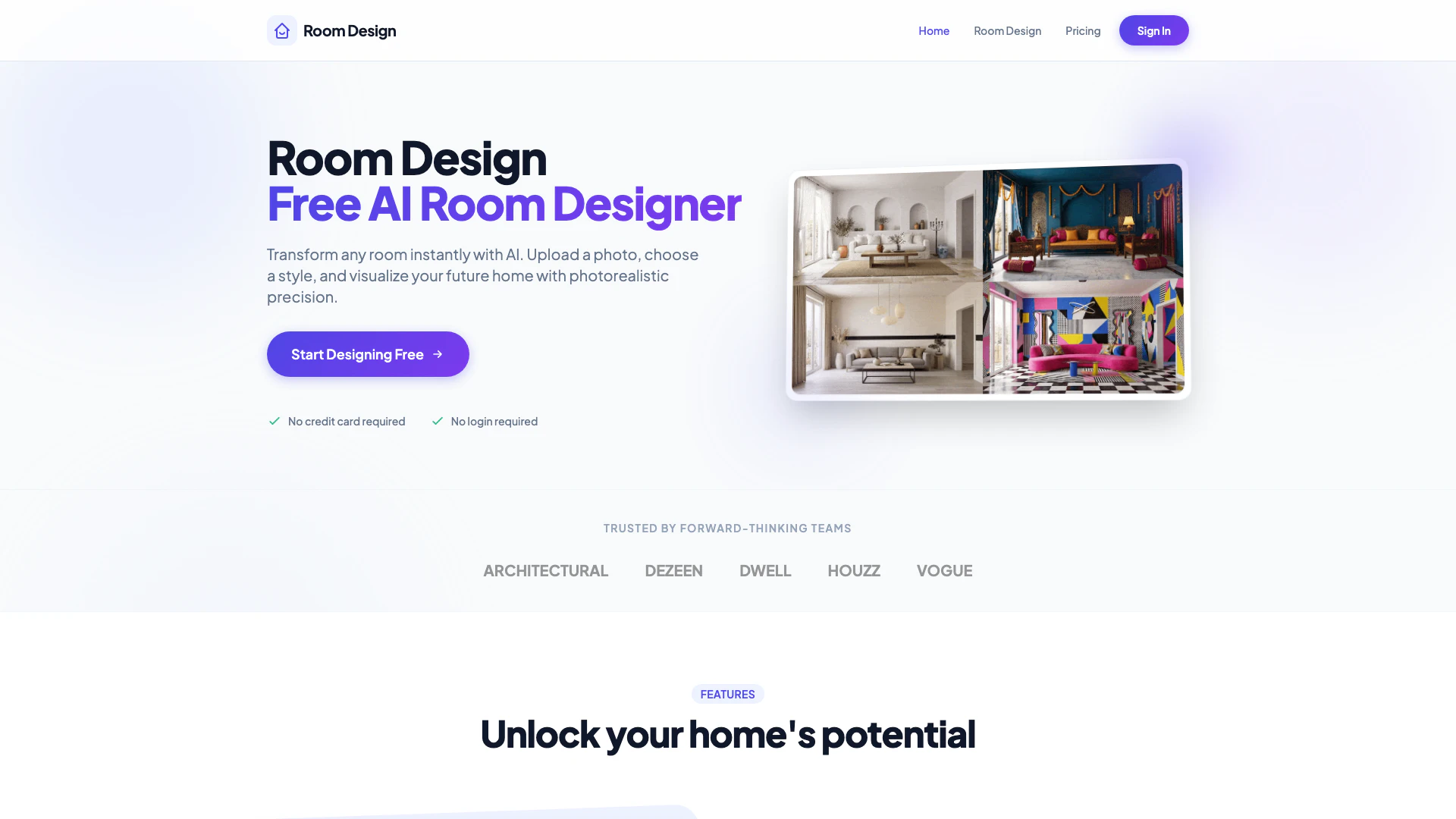 Roomdesign offers several key features to enhance your interior design experience: - Transform Your Room Instantly: Upload a photo and explore various interior styles in seconds. - Reimagine Your Room: Visualize how your space could look after a renovation with AI-generated redesigns. - Smart Furniture Matching: Get curated furniture combinations tailored to your room's layout and selected style. - Intelligent Color & Lighting Suggestions: Receive personalized recommendations for flooring, wall colors, and lighting to create a harmonious atmosphere. - Update Any Part of Your Room: Change specific elements like sofas or wall colors without altering the entire room.