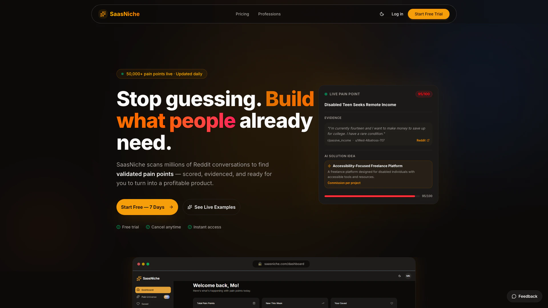 SaasNiche scans millions of Reddit conversations to identify validated pain points, providing evidence and scoring to help you build products that people actually need.