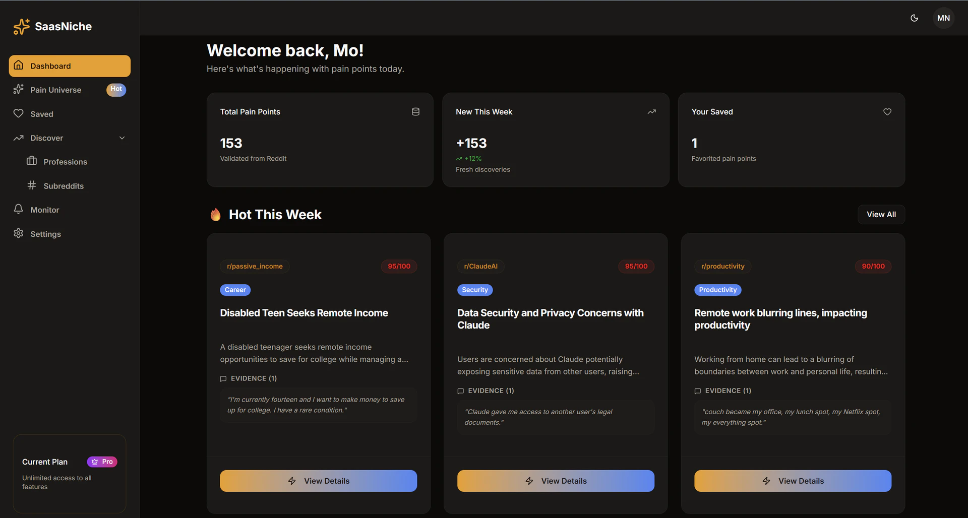 - Validated Pain Point Discovery: SaasNiche scans millions of Reddit conversations to identify and validate pain points, ensuring that users can build products that meet real market needs.