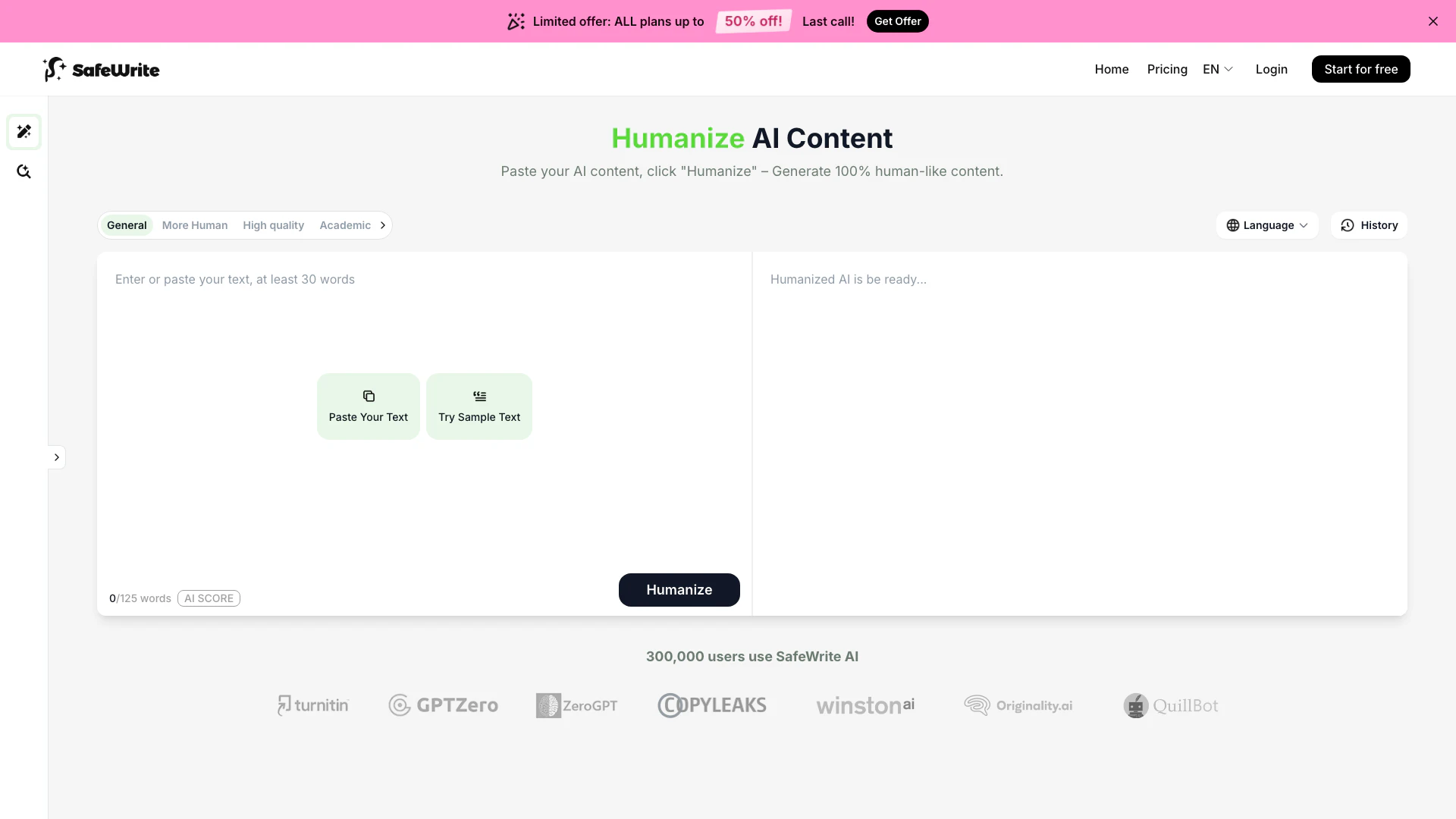 - High-Quality Humanization: The tool transforms AI-generated text into 100% human-like content, improving readability and engagement.