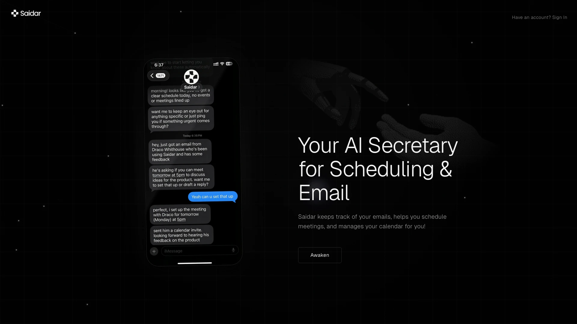 Saidarai is an innovative AI-powered[1] tool designed to act as your personal assistant[2] for scheduling and email management. By streamlining the process of tracking emails and organizing meetings, Saidarai helps users effectively manage their calendars. With its intuitive interface, users can easily access and utilize its features to enhance productivity and ensure they never miss an important appointment or message.