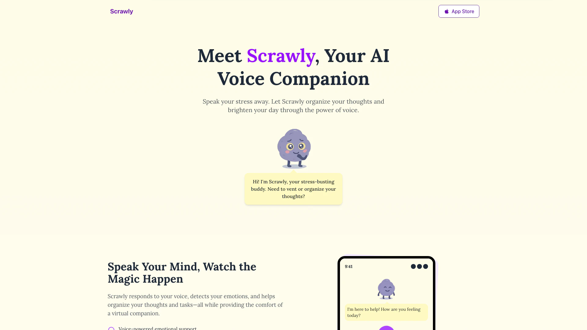 - Voice-Powered Emotional Support: Scrawly offers voice-powered emotional support, helping users express their feelings and manage stress effectively.