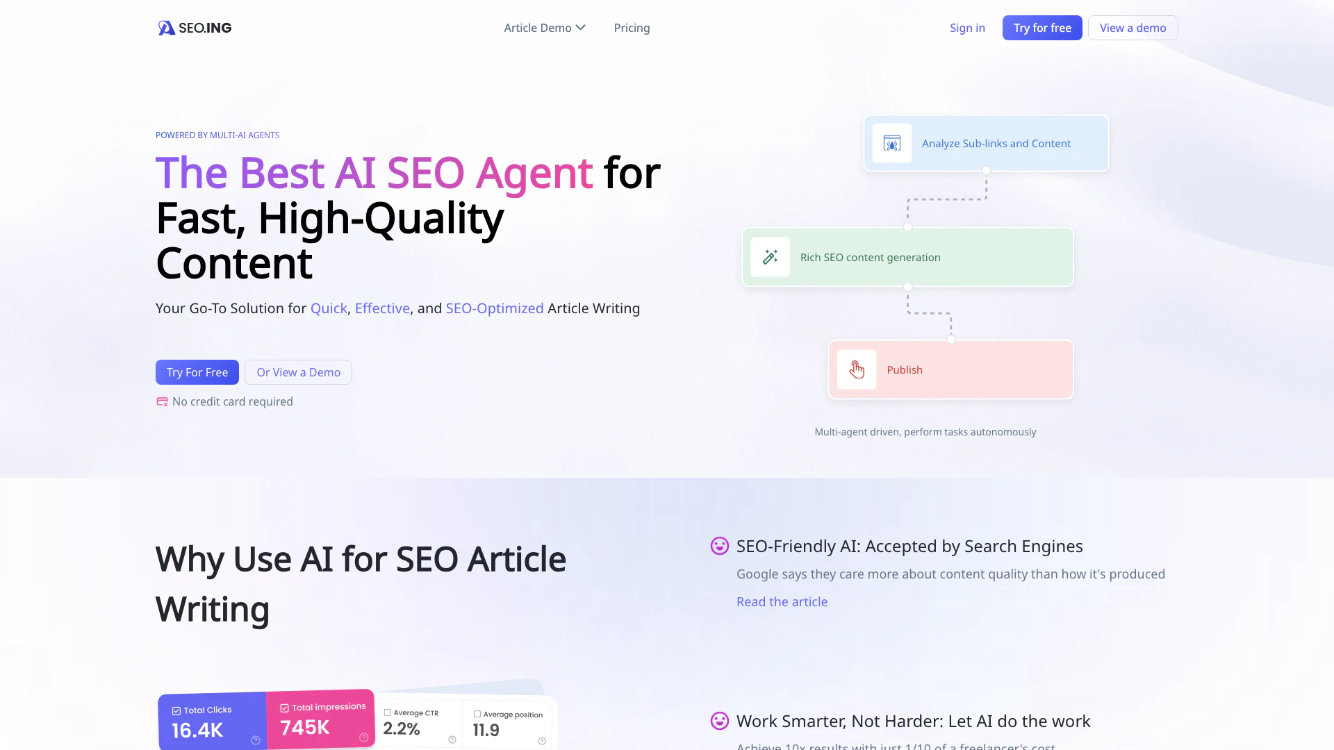 - Multi-Agent System: Utilizes multiple AI agents to autonomously generate high-quality SEO content, enhancing efficiency and output.