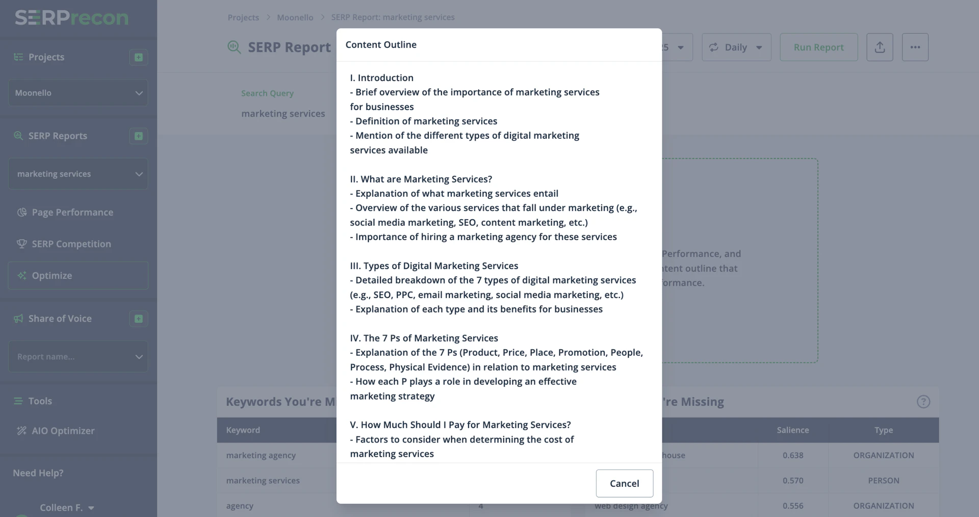 - Analyze Competitor Data: SERPrecon will compare your site with competitors, providing insights into keyword gaps and content performance.