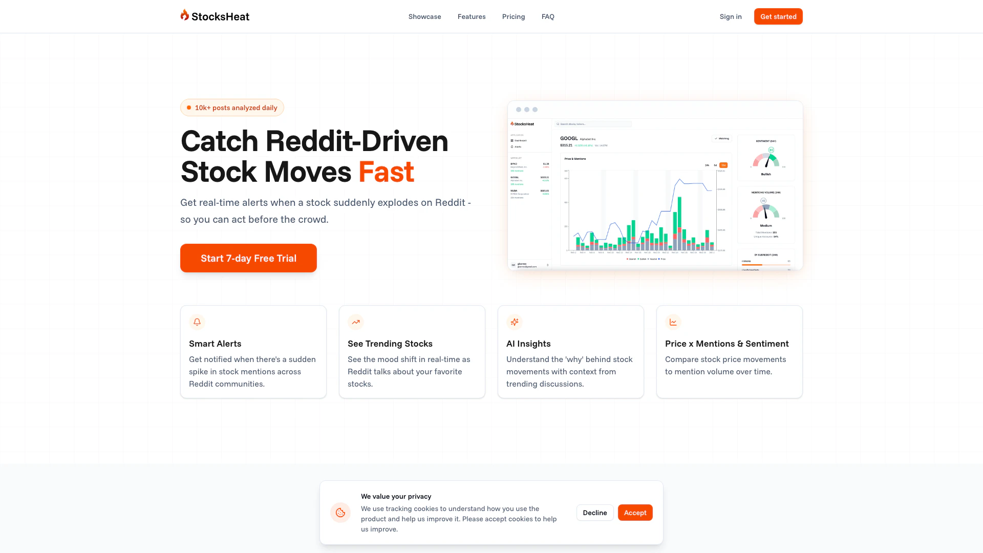 StocksHeat is an innovative tool designed to provide real-time alerts[1] for stock movements driven by discussions on Reddit. It allows users to catch emerging stock trends[3] before they become mainstream, offering insights into the sentiment surrounding various stocks based on Reddit chatter. By monitoring and analyzing stock mentions across various Reddit communities, StocksHeat helps traders and investors make informed decisions by acting on early signals of stock movements.