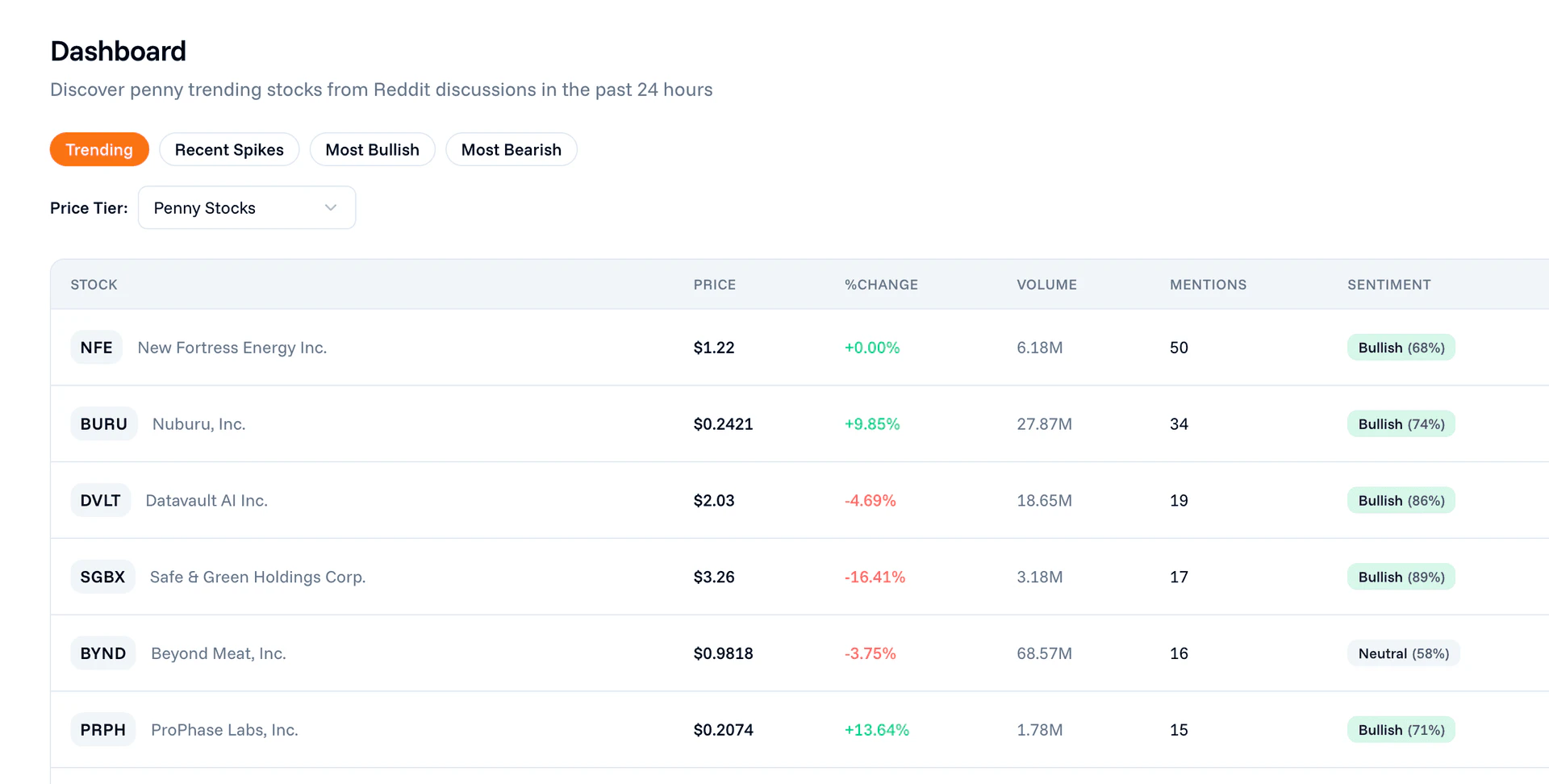 - Monitor Trends: Use the dashboard to view trending stocks in real-time and analyze their mention volume and sentiment.