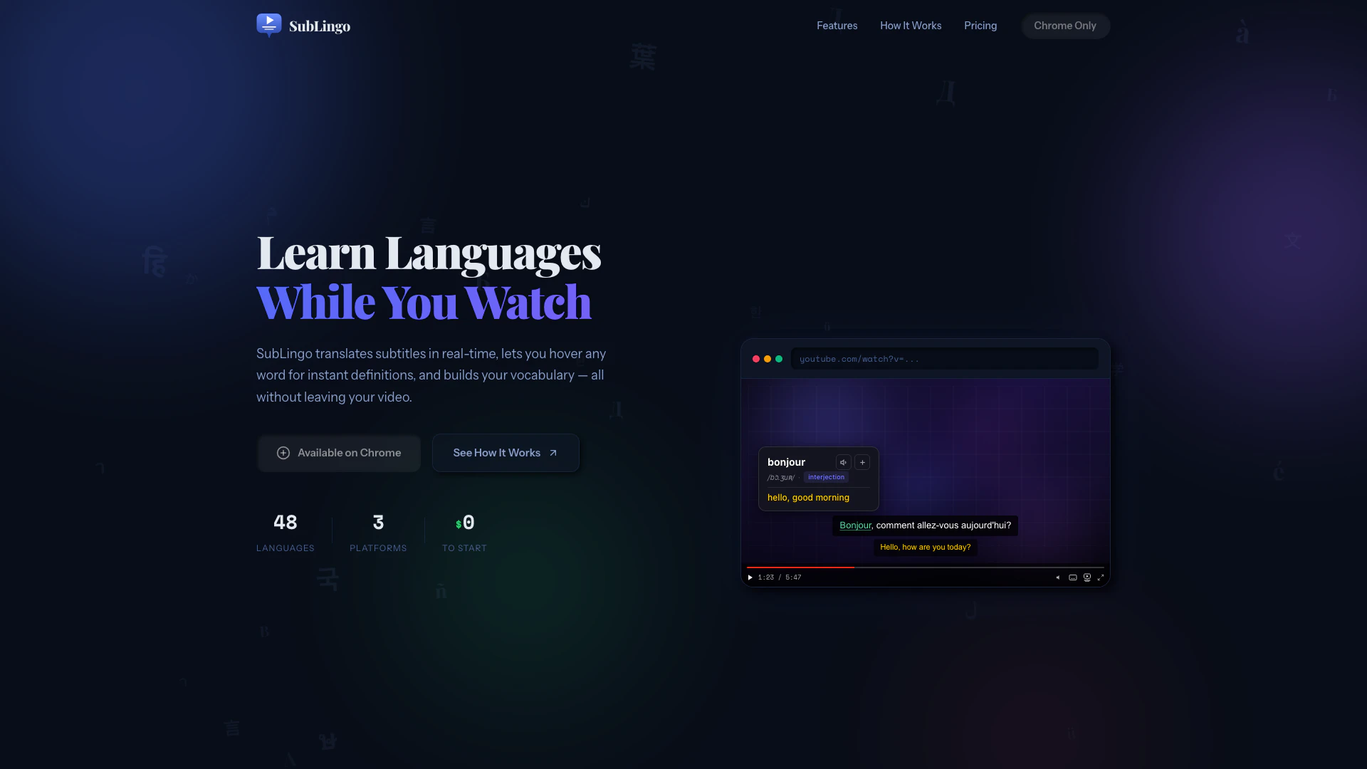 SubLingo is an innovative language learning tool designed to translate subtitles in real-time on popular streaming platforms like YouTube and Netflix. It enables users to hover over words for instant definitions, thereby enhancing vocabulary acquisition while watching videos. This seamless integration allows learners to immerse themselves in a language naturally, making learning more engaging and effective.