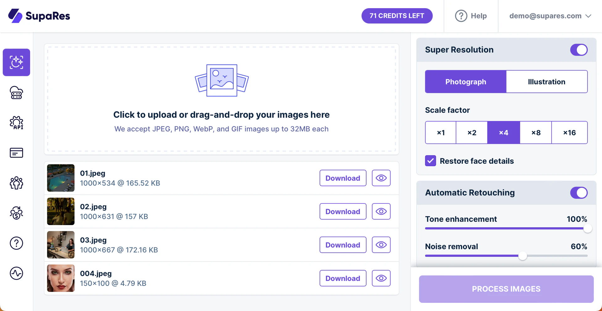 - User-Friendly Interface: SupaRes provides an intuitive UI that allows users to easily upload and enhance images without requiring extensive technical knowledge.