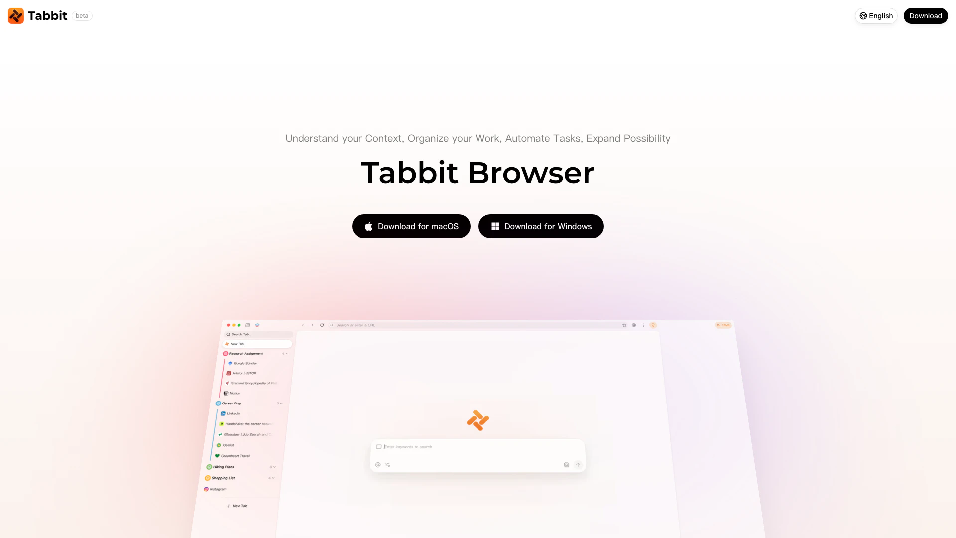 - Download and Install: Visit the official website and download Tabbitbrowser for your operating system (macOS or Windows). Follow the installation instructions provided.