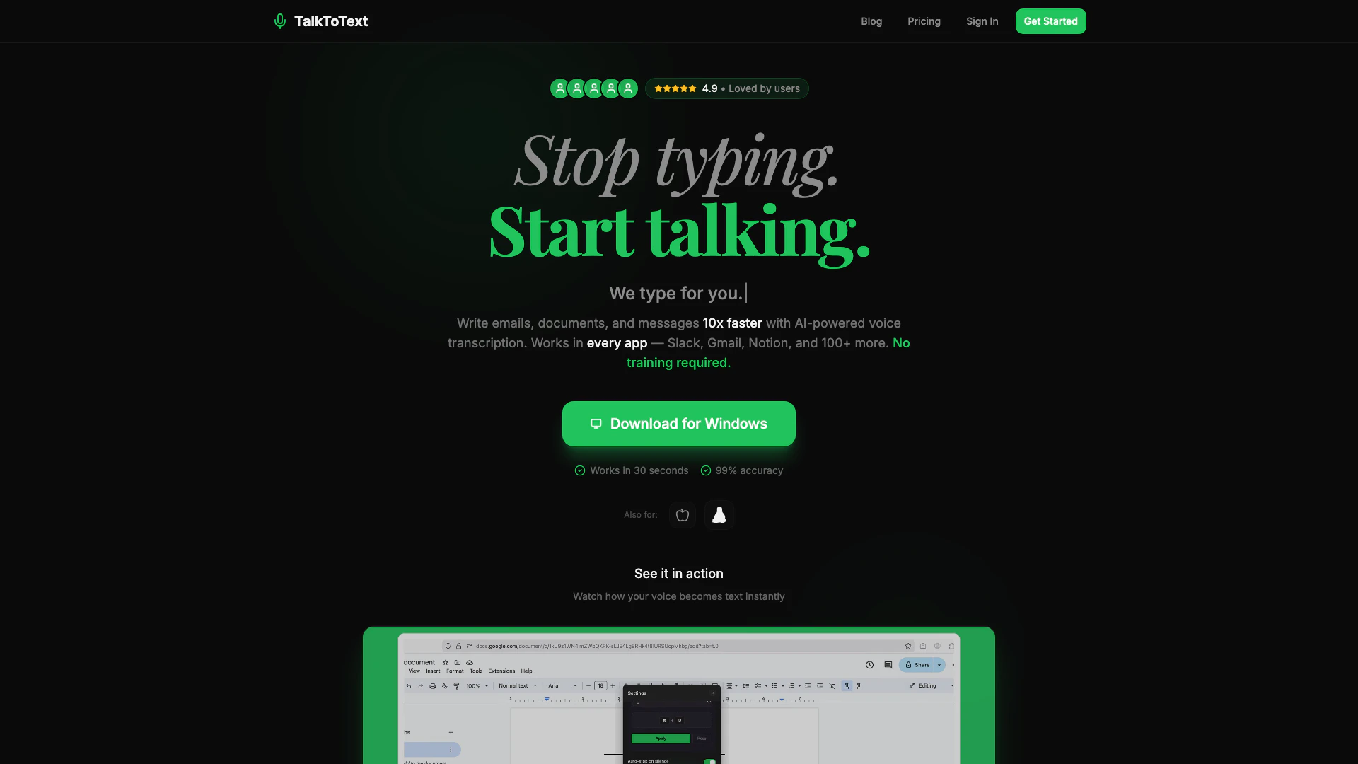 TalkToText is a voice-to-text AI tool that transforms your voice into polished text instantly, allowing you to write emails, documents, and messages faster with AI-powered voice transcription.