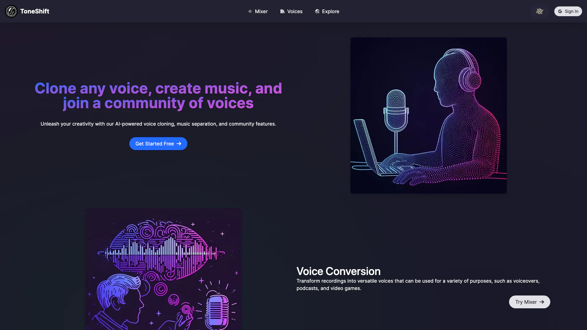 ToneShift is an AI-powered platform that allows users to clone voices, separate music into vocals and instrumentals, and join a community for creative collaboration.