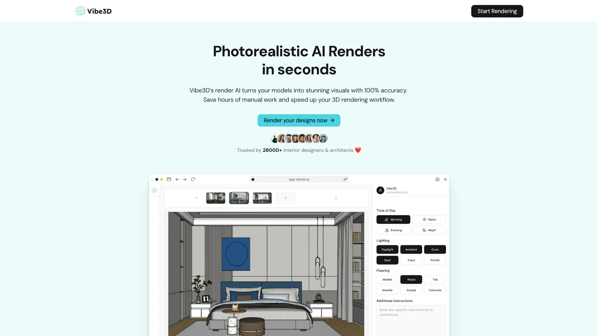 Vibe3D is an innovative AI-driven interior design and architectural rendering software that enables users to create stunning, photorealistic 3D renders from various modeling tools, including SketchUp, 3ds Max, Revit, Archicad, and Rhino. With its advanced rendering capabilities, Vibe3D transforms 3D models into high-quality visuals in seconds, preserving all materials, textures, and scene structures. This tool is designed to streamline the rendering process, significantly reducing manual work and enhancing productivity for architects and interior designers.