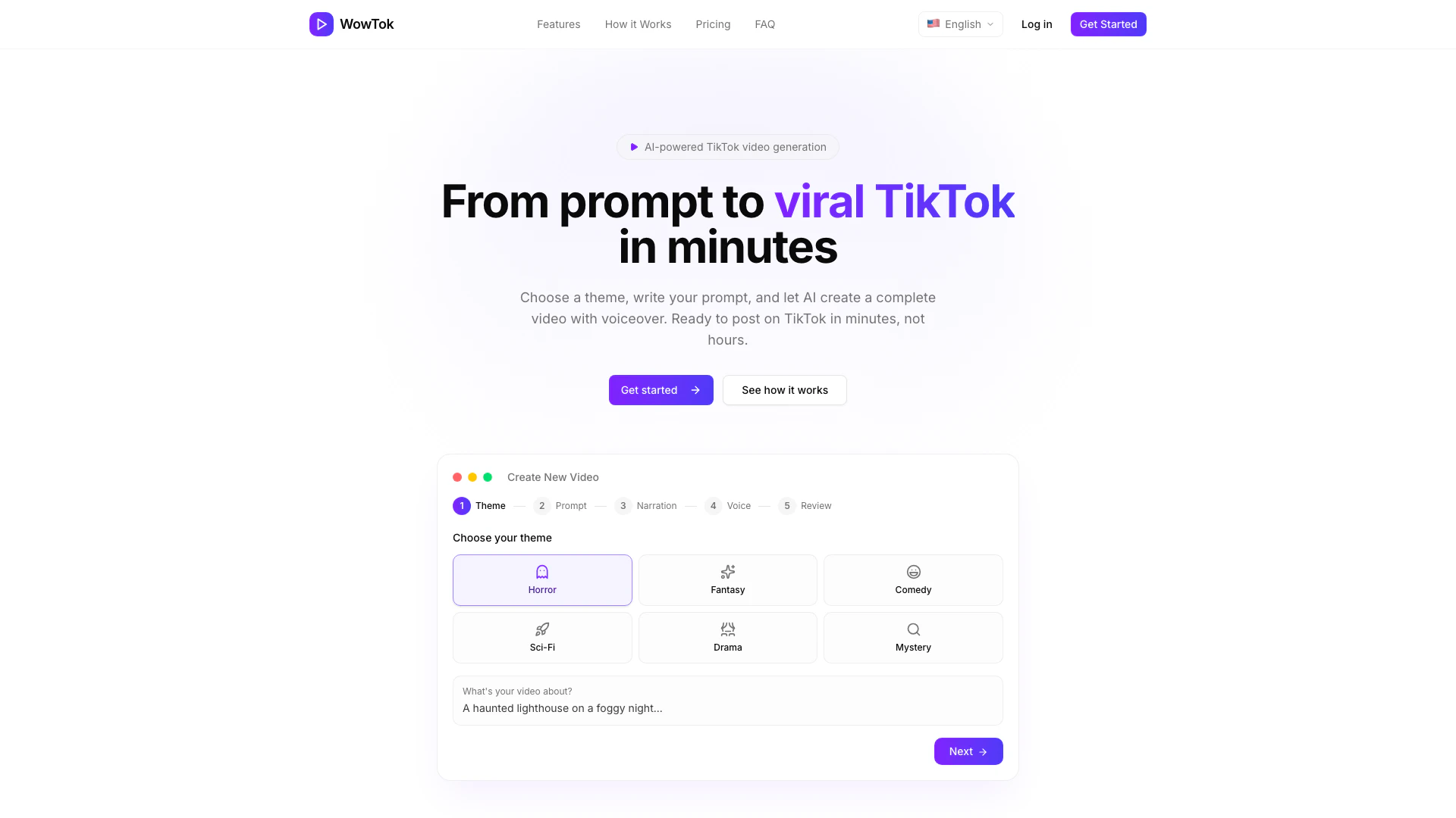 - Choose your theme & prompt: Select a theme such as horror, fantasy, or comedy, and describe what your video should be about.