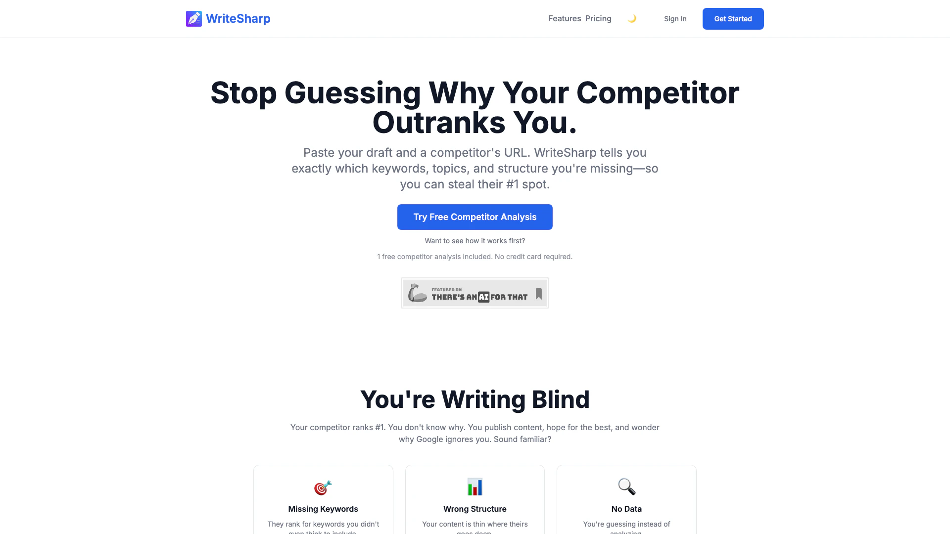 WriteSharp is an AI-powered content optimization[1] platform designed to help users improve their content's performance by providing detailed competitor analysis[2]. It allows users to compare their content against competitors to identify keyword gaps[3], missing topics, and structural weaknesses. With WriteSharp, you can understand why your competitors outrank you and gain insights into how to enhance your content strategy effectively.