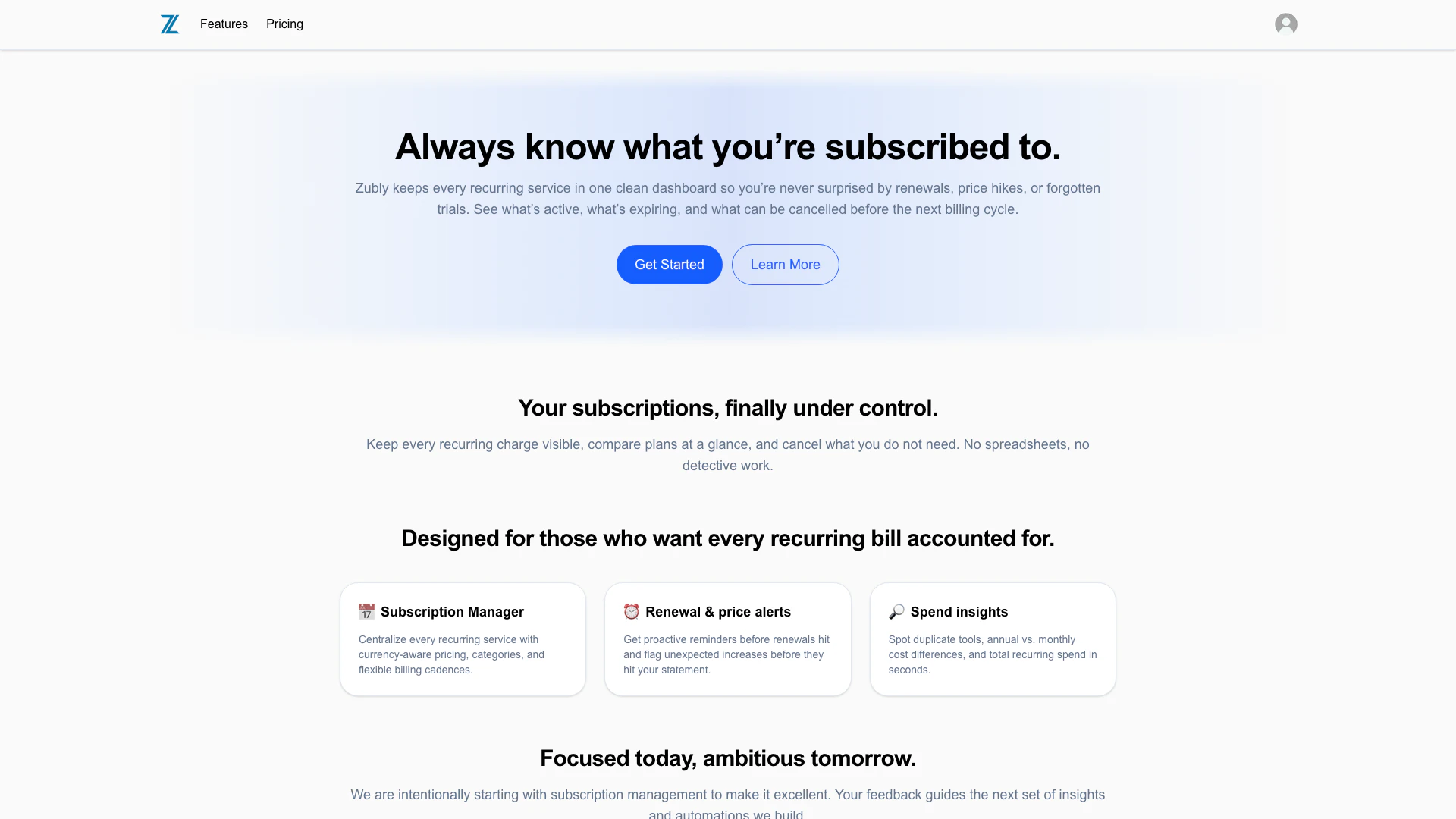 Zubly is a subscription management[1] tool designed to help users take control of their recurring payments[2]. It offers a simple and efficient way to track, manage, and cancel subscriptions in one centralized dashboard[3]. By consolidating all your subscriptions, Zubly ensures that you are always aware of your active services, renewal dates, and any potential price increases, allowing for better financial management.