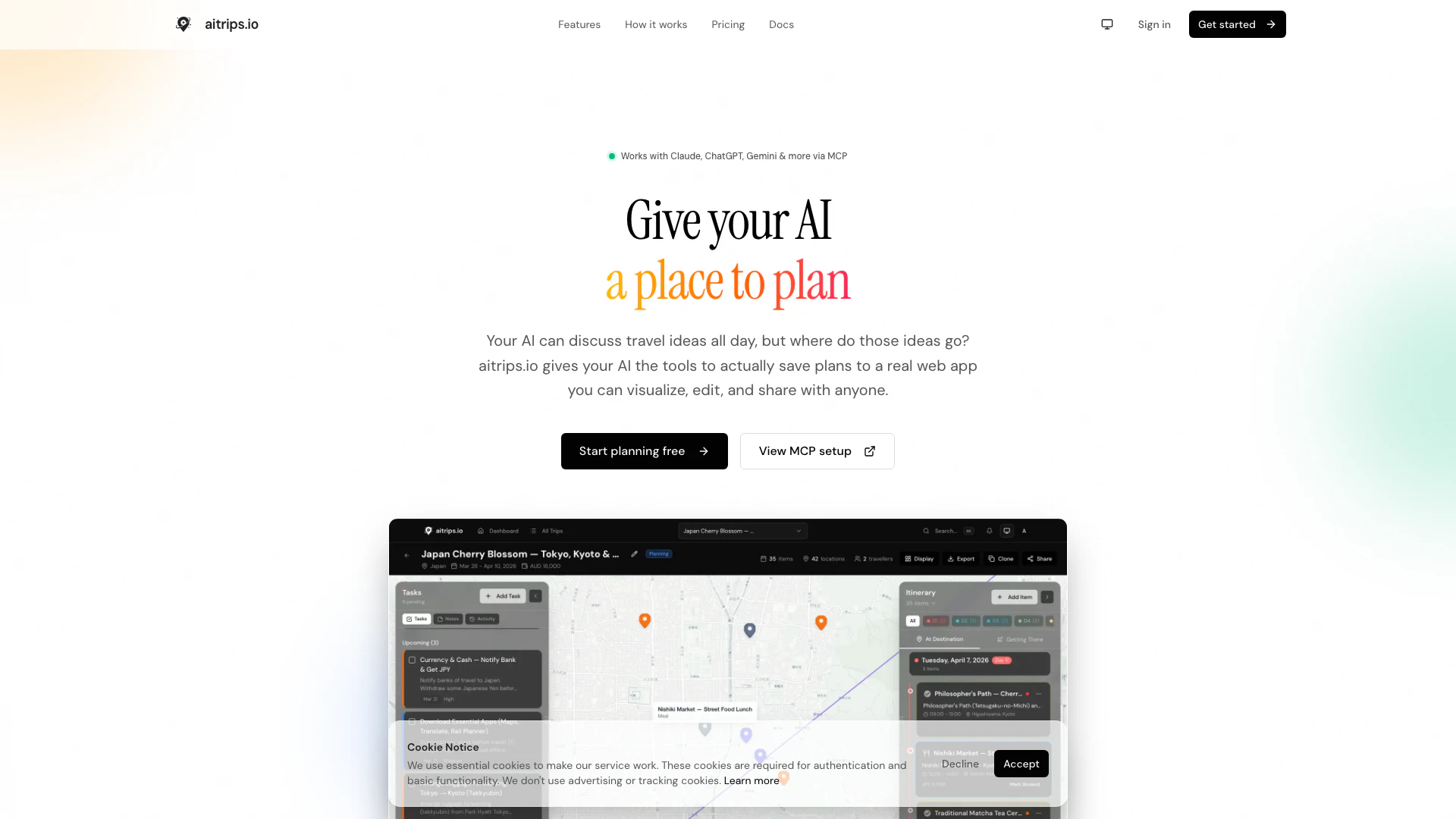 - MCP 整合:輕鬆連接到 Claude、ChatGPT 或任何兼容 MCP 的 AI,直接與您的旅行計劃互動。