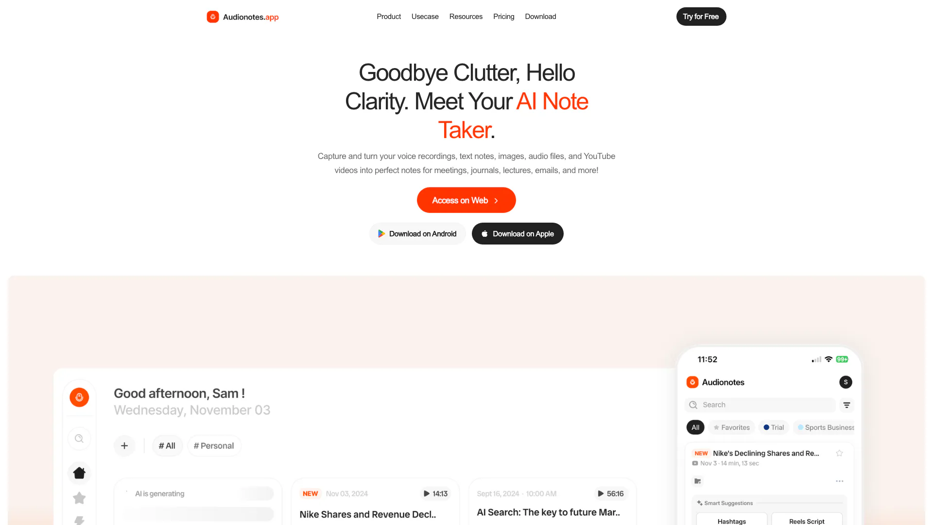 Audionotes 允許您捕捉並將語音錄音、文本筆記、圖像、音頻檔案和 YouTube 影片轉化為各種用途的有組織筆記。
