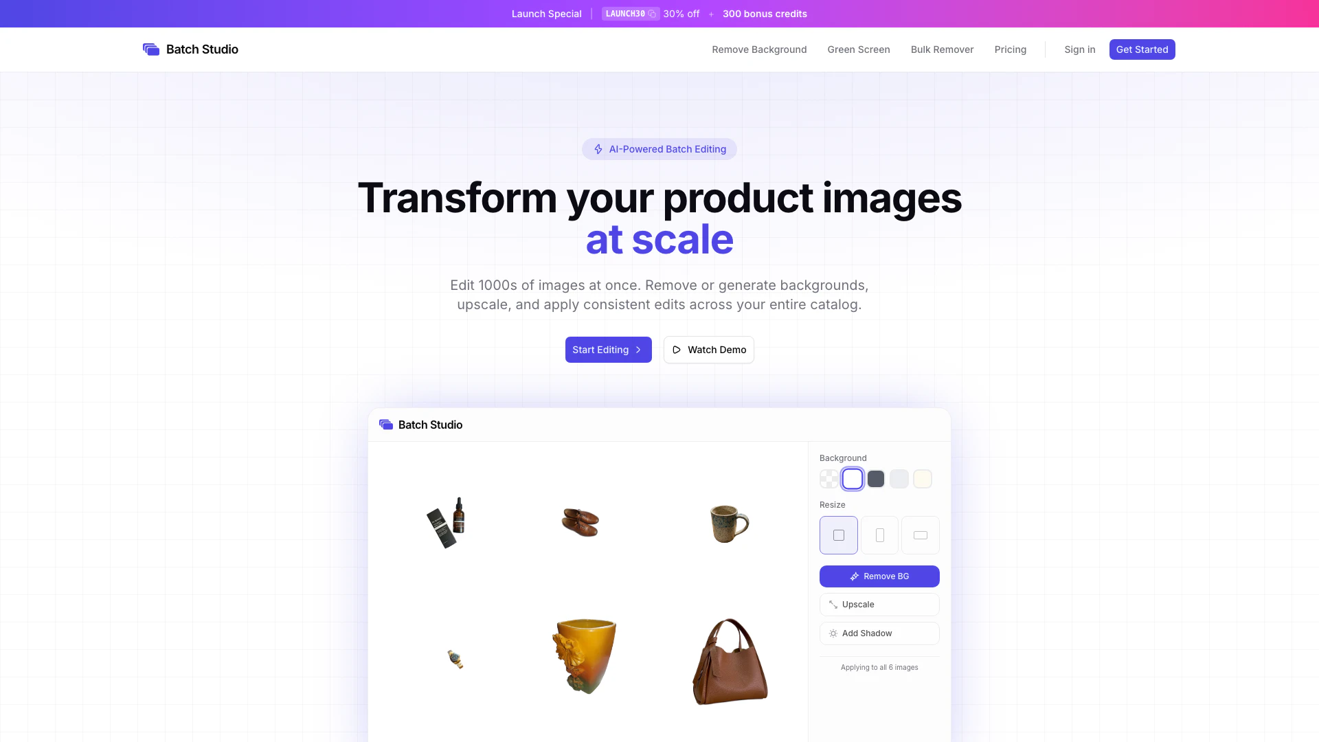 Batch Studio 是一個由 AI 驅動的批量圖像編輯工具,專為電子商務賣家和創作者設計。它允許用戶大規模轉換產品圖像,使他們能夠一次編輯成千上萬的圖像。