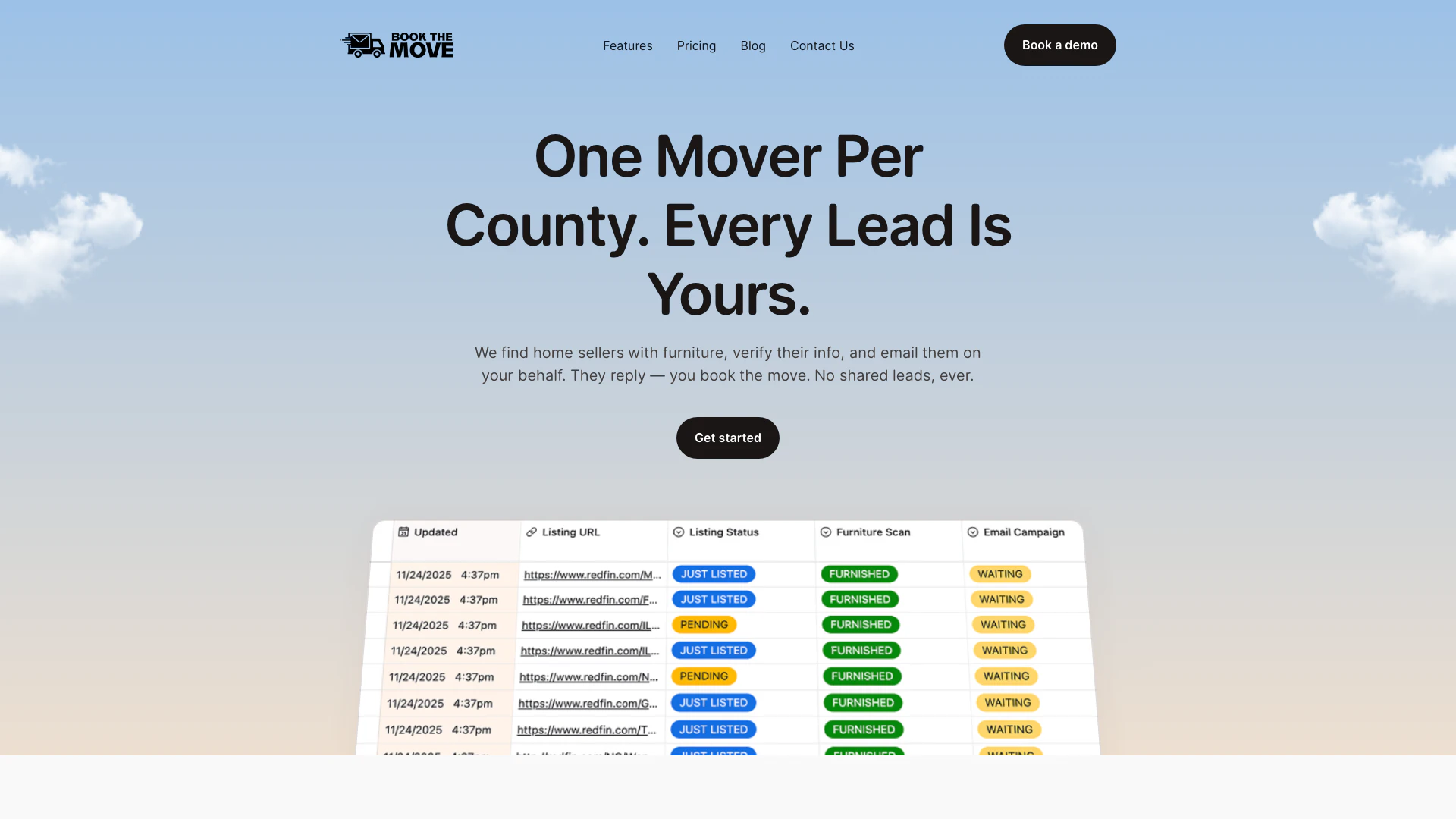 - 專屬搬家線索: Bookthemove為搬家公司提供專屬線索,確保同一縣內沒有其他搬家公司收到相同的線索,從而增強競爭力和潛在銷售。