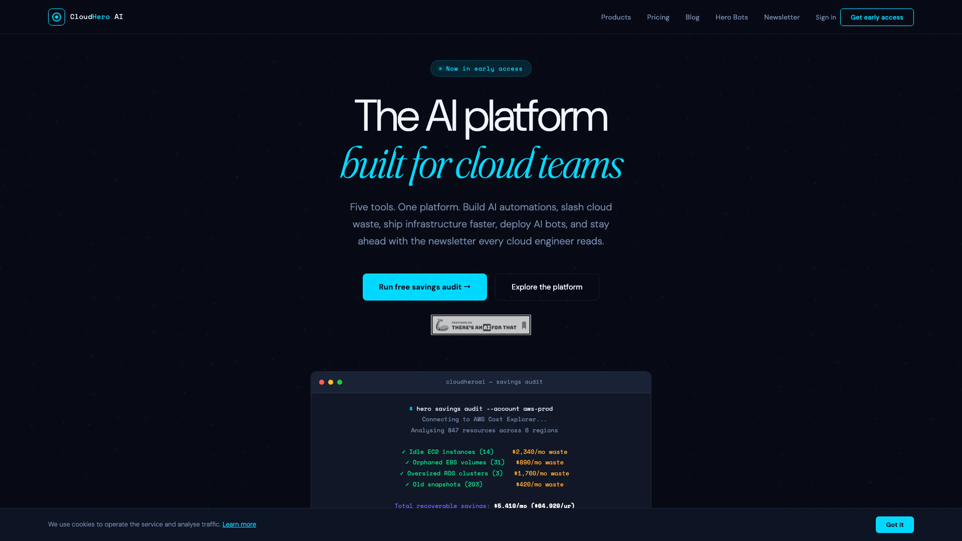 Cloudheroai 提供五種為雲端團隊設計的 AI 工具,包括 AI 工作流程建構器、雲端成本優化器、DevOps AI 副駕駛、AI 聊天機器人建構器,以及每週通訊。