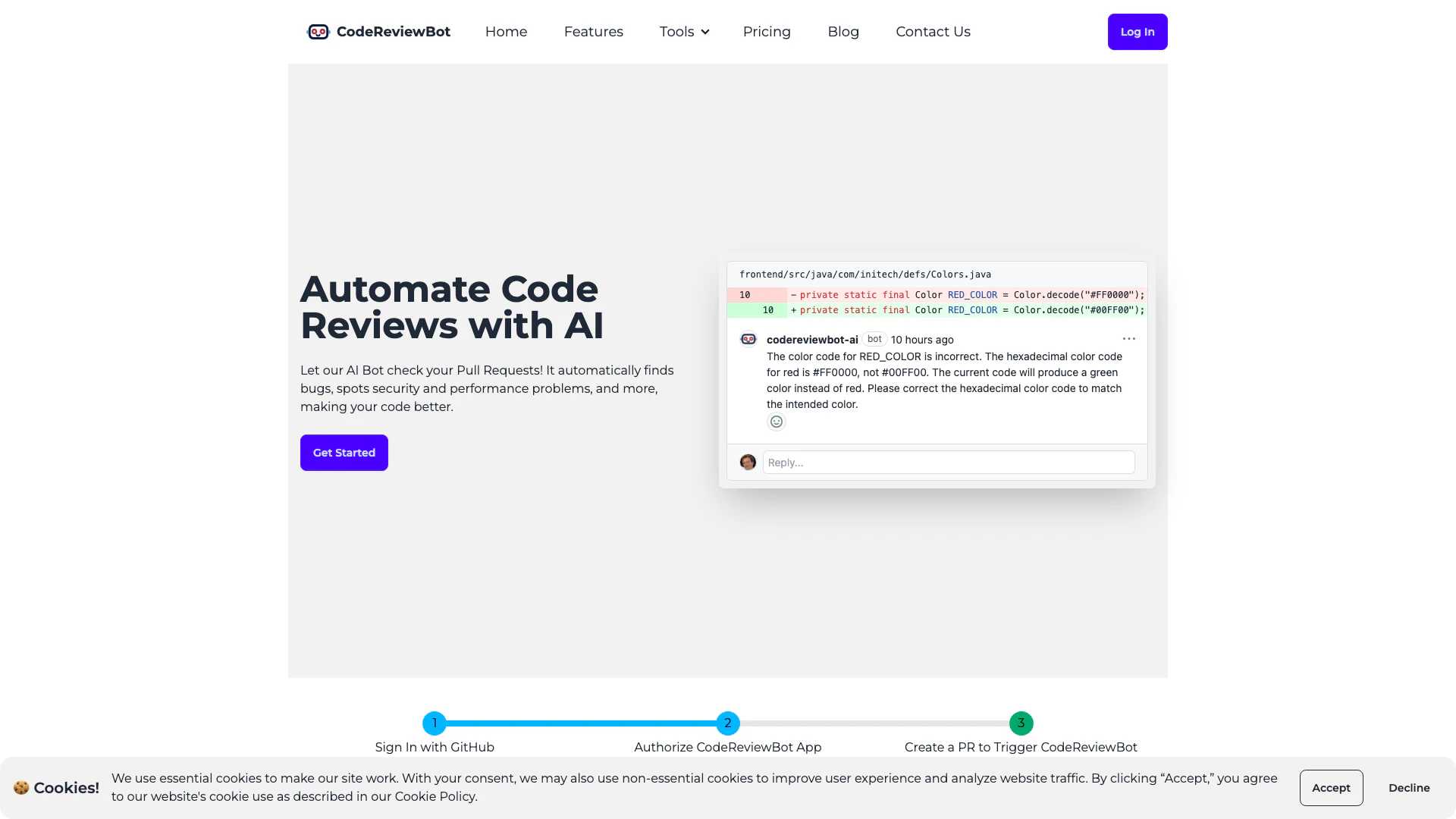 - 自動化拉取請求審查:開發人員可以使用 CodeReviewBot.ai 自動審查拉取請求,確保一致的反饋並減少手動審查工作量。