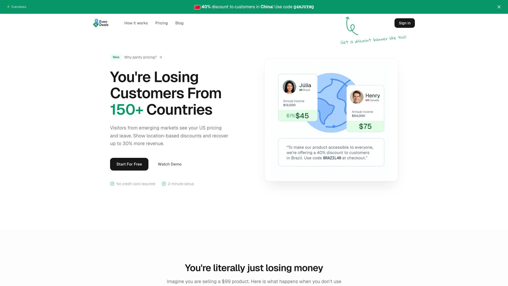 Evendeals 是為向國際觀眾銷售產品或服務的在線企業設計的,包括 SaaS 公司、在線課程創作者和數字產品銷售商。如果您的業務因國際訪客的定價障礙而失去潛在客戶,Evendeals 可以通過提供基於位置的折扣來幫助您捕獲這部分收入,這些折扣符合不同的購買力。
